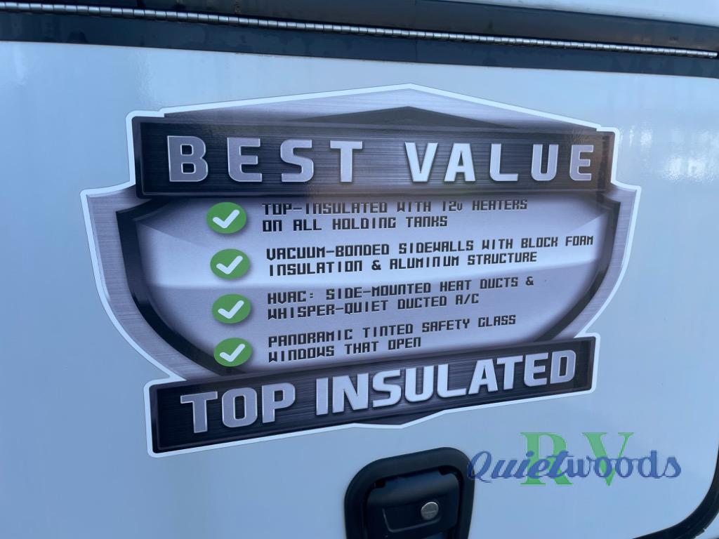 This travel trailer is decked out in features you will love like the front walk-in wardrobe with washer/dryer prep inside the front private bedroom! The full bathroom has everything you will need to get squeaky clean each morning including a residential walk-in shower with a skylight to let in some natural lighting. There is a hutch for you to store your dishes and a kitchen island to make meal prepping even easier. Once you have created a delicious meal, you can head to the booth dinette and enjoy eating it there comfortably while enjoying your view out of the panoramic window!