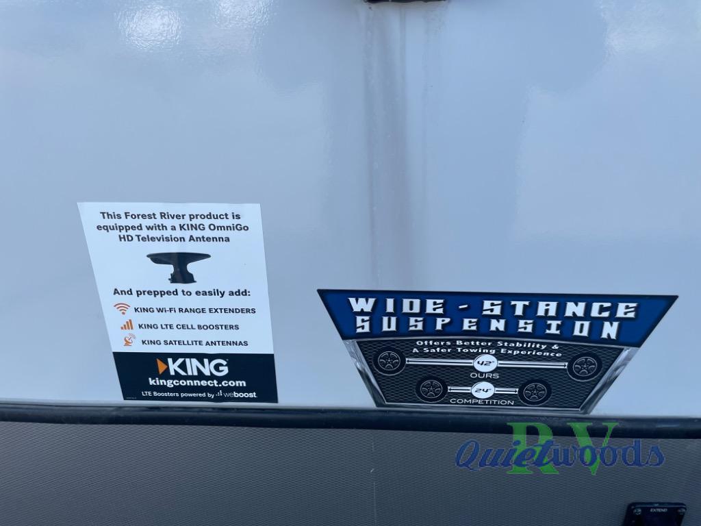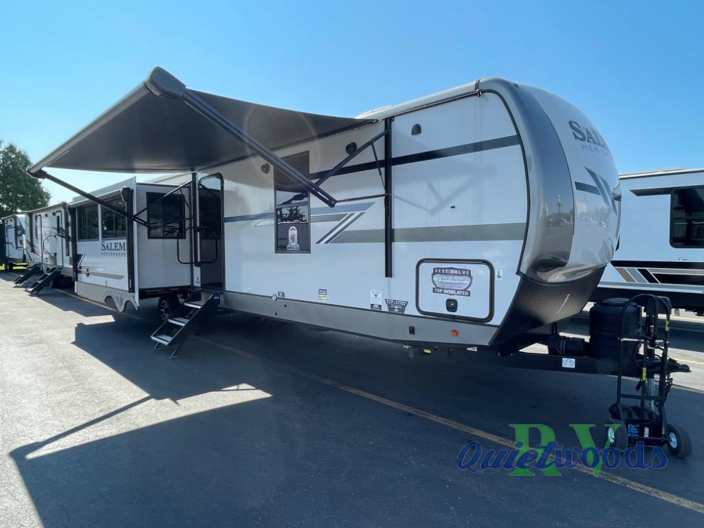 With each Forest River Salem Hemisphere fifth wheel and travel trailer, there are vacuum bonded "Aluma Frame" sidewalls and floors and square windows with built-in shades with reflecting thermal-foil backing and painted hardwood trim. You'll also find Goodyear radial tires with black accented rims and a 60K BTU on-demand tankless water heater for hassle-free camping. The 15K BTU Quiet Cool A/C on a Race Track duct system will keep you comfortable all summer long, and the LED TV and Furrion soundbar with FM/Bluetooth/HDMI/USB will keep you entertained on rainy days. You'll find many comforts inside, along with ample storage space for your belongings and gear, full bath and kitchen amenities, plus comfortable seating and sleeping spaces!