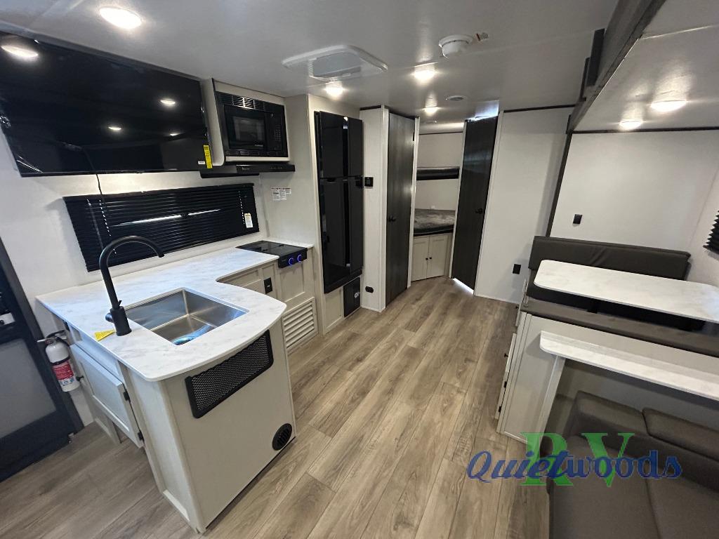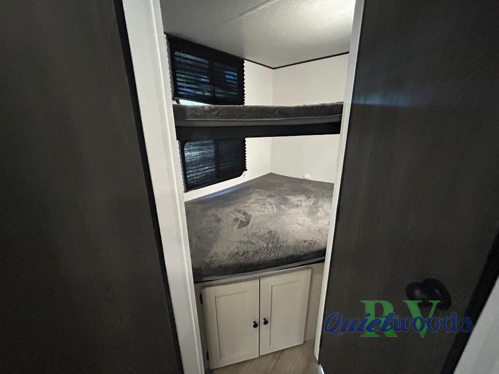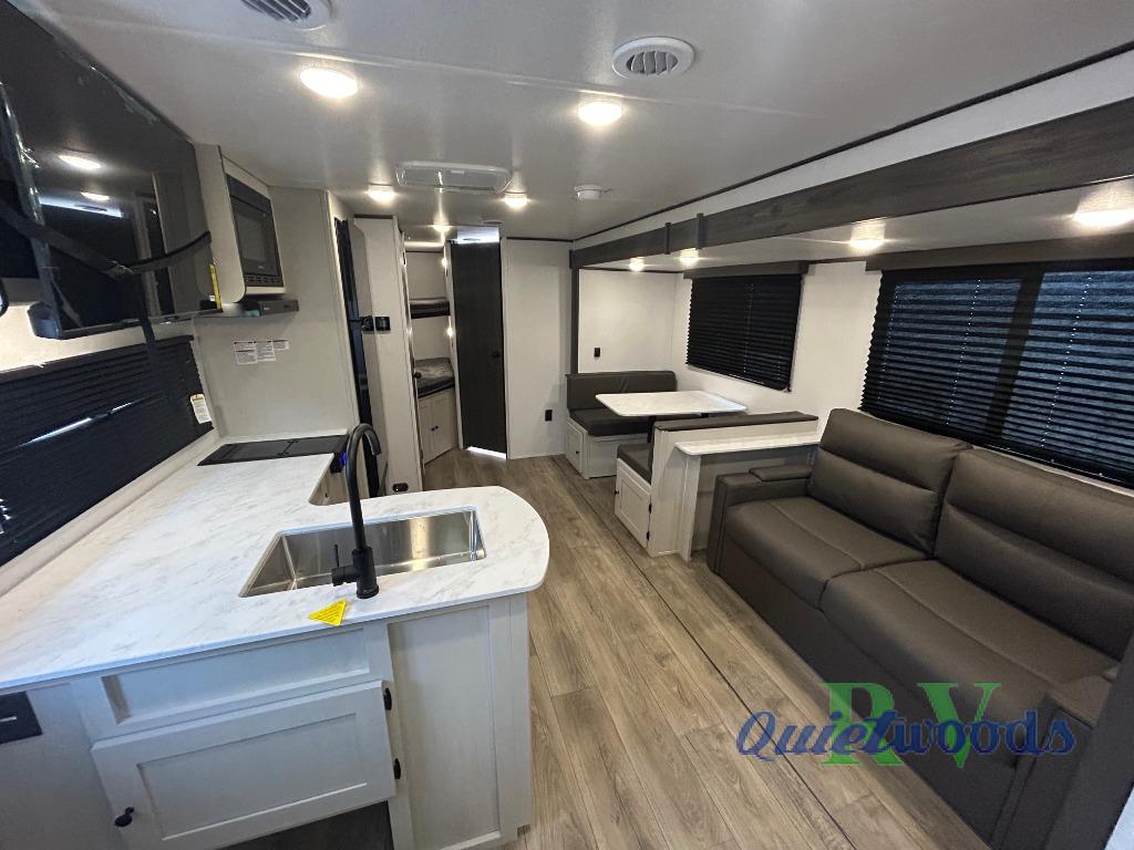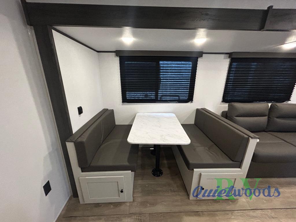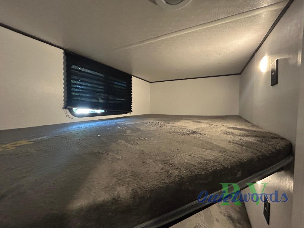 Camping trips are made complete in this spacious travel trailer! You can wake up feeling refreshed each morning in the front private bedroom that includes a queen bed and underbed storage, and there is a full bath towards the back to get ready for your day. The double-size bunks are sure to be a hit with the little ones or your guests, and the large pantry beside the bunks include washer/dryer hookups if you want to add these appliances. An L-shaped counter in the kitchen will provide more space as you prep breakfast on the two burner cooktop, and there is a 12V refrigerator to keep the eggs and milk cold. Your crew can dine at the booth dinette, relax on the sofa with a theater seating option, or take your plates outdoors under the 20' power awning!