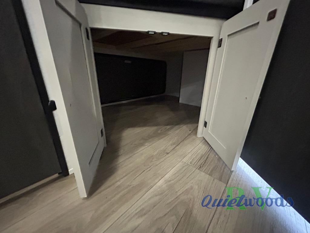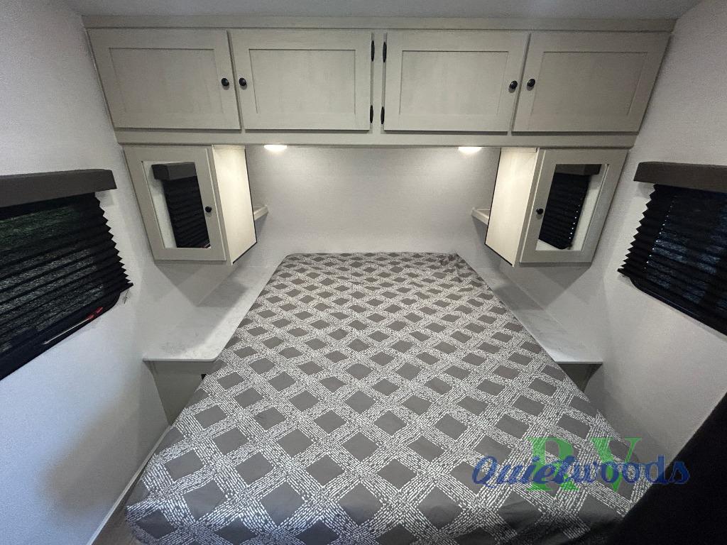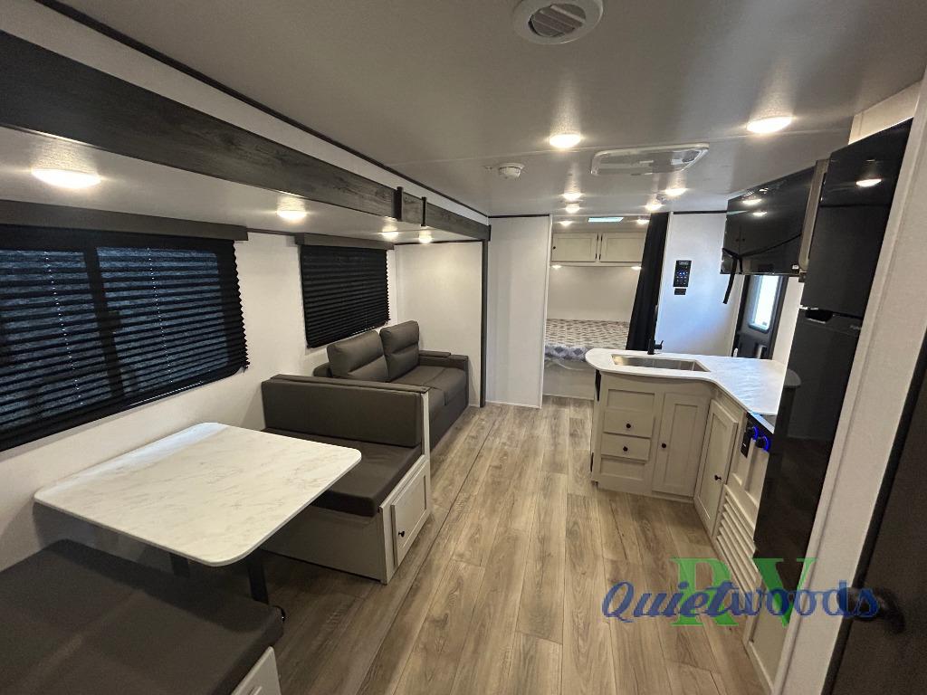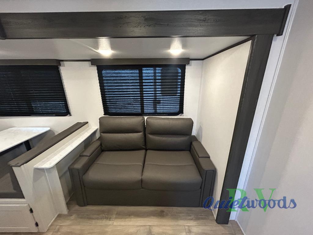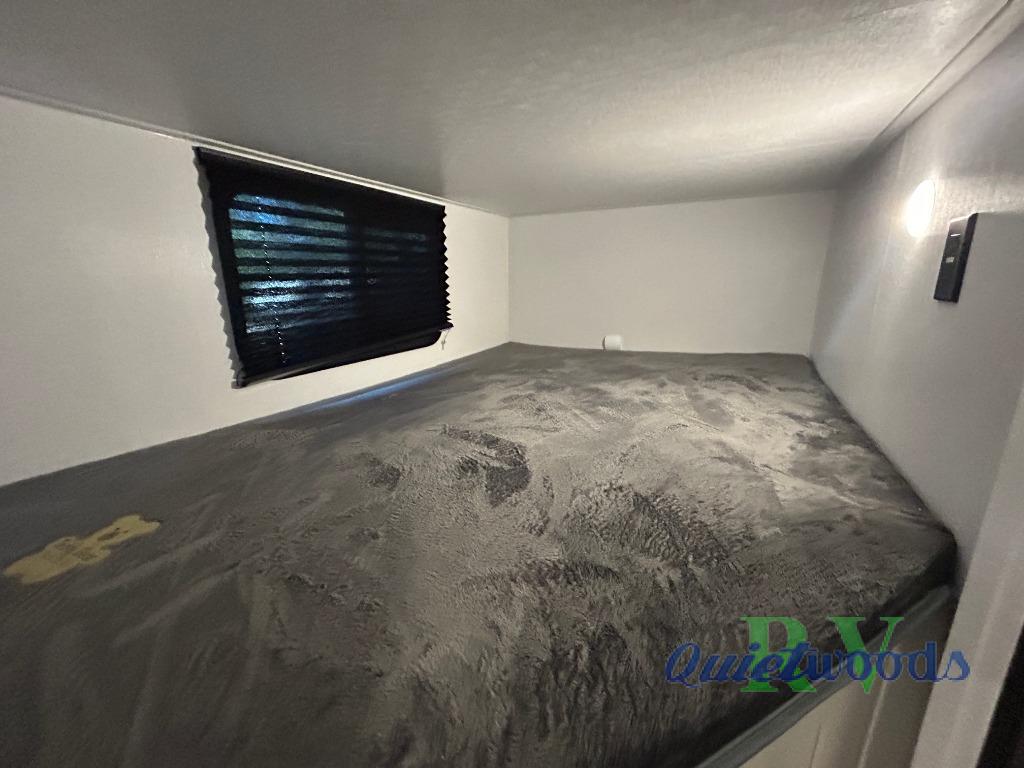Camping trips are made complete in this spacious travel trailer! You can wake up feeling refreshed each morning in the front private bedroom that includes a queen bed and underbed storage, and there is a full bath towards the back to get ready for your day. The double-size bunks are sure to be a hit with the little ones or your guests, and the large pantry beside the bunks include washer/dryer hookups if you want to add these appliances. An L-shaped counter in the kitchen will provide more space as you prep breakfast on the two burner cooktop, and there is a 12V refrigerator to keep the eggs and milk cold. Your crew can dine at the booth dinette, relax on the sofa with a theater seating option, or take your plates outdoors under the 20' power awning!