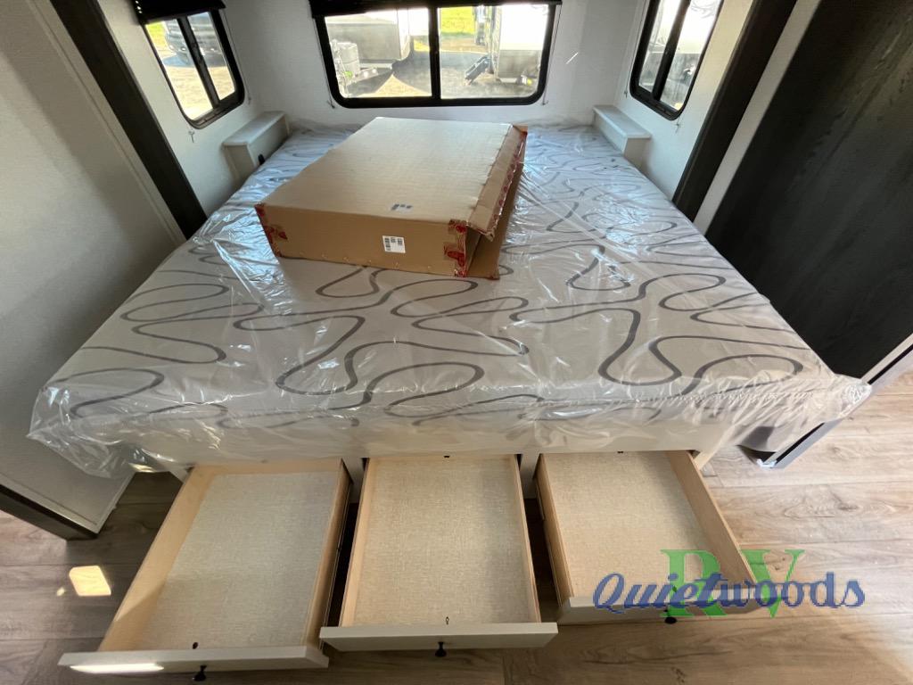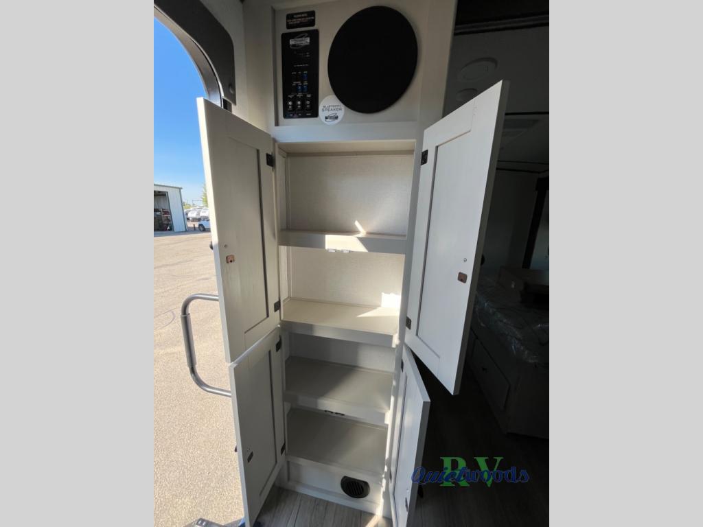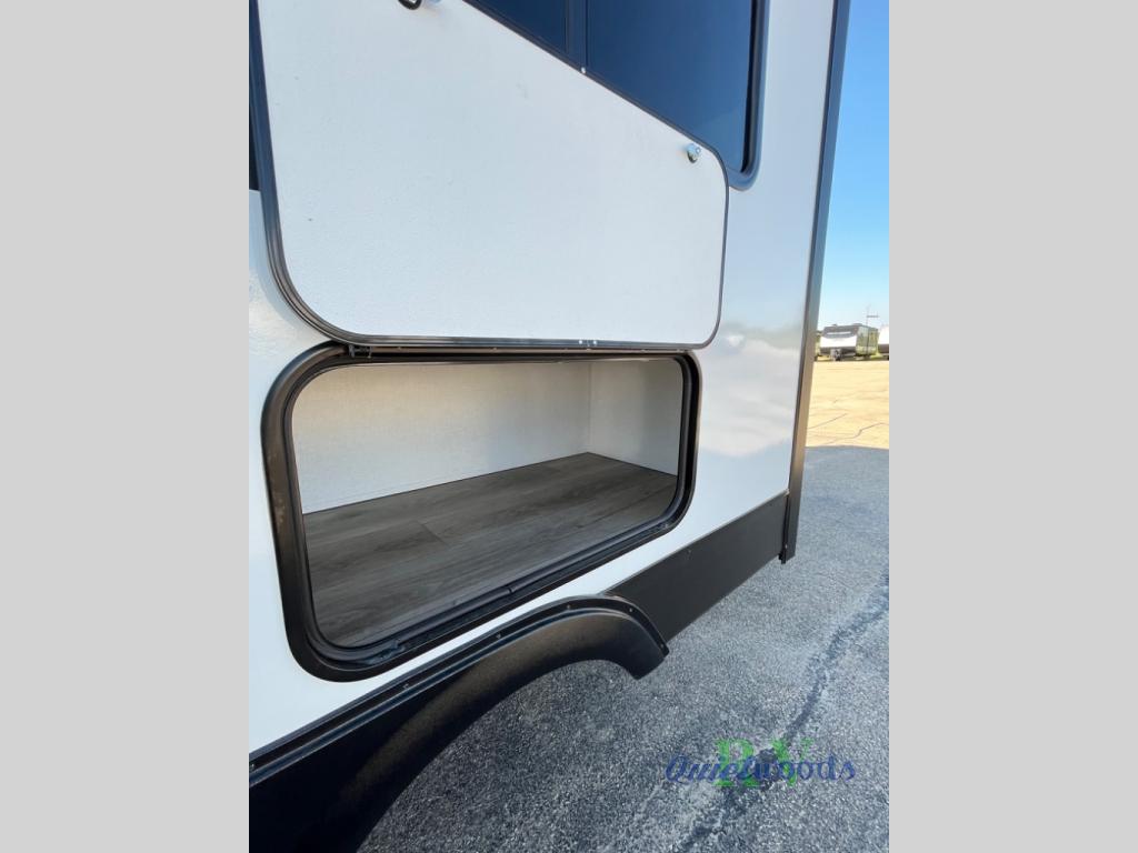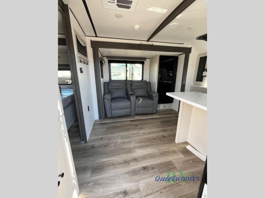 A rear bath with dual sink vanity, a king bed slide with drawers beneath for plenty of storage, and a front kitchen with breakfast bar and pantry as you enter all make this a great unit. You will enjoy plenty of space with a large slide in the bedroom and combined living area and kitchen. Theater seats are perfect for winding down your day inside, and a slide out king bed is a great way to enjoy a great night's rest. There is even washer and dryer prep in the bedroom if you choose to add those appliances! In the very rear of the unit, a spacious bath with large shower, a linen cabinet and dual sink vanity so both can get ready at once. In the front kitchen you will find all the amenities to enjoy creating meals and snacks as you travel. There are two pantries with one just inside the door to your left, and one along the front wall near the refrigerator and theater seating slide.