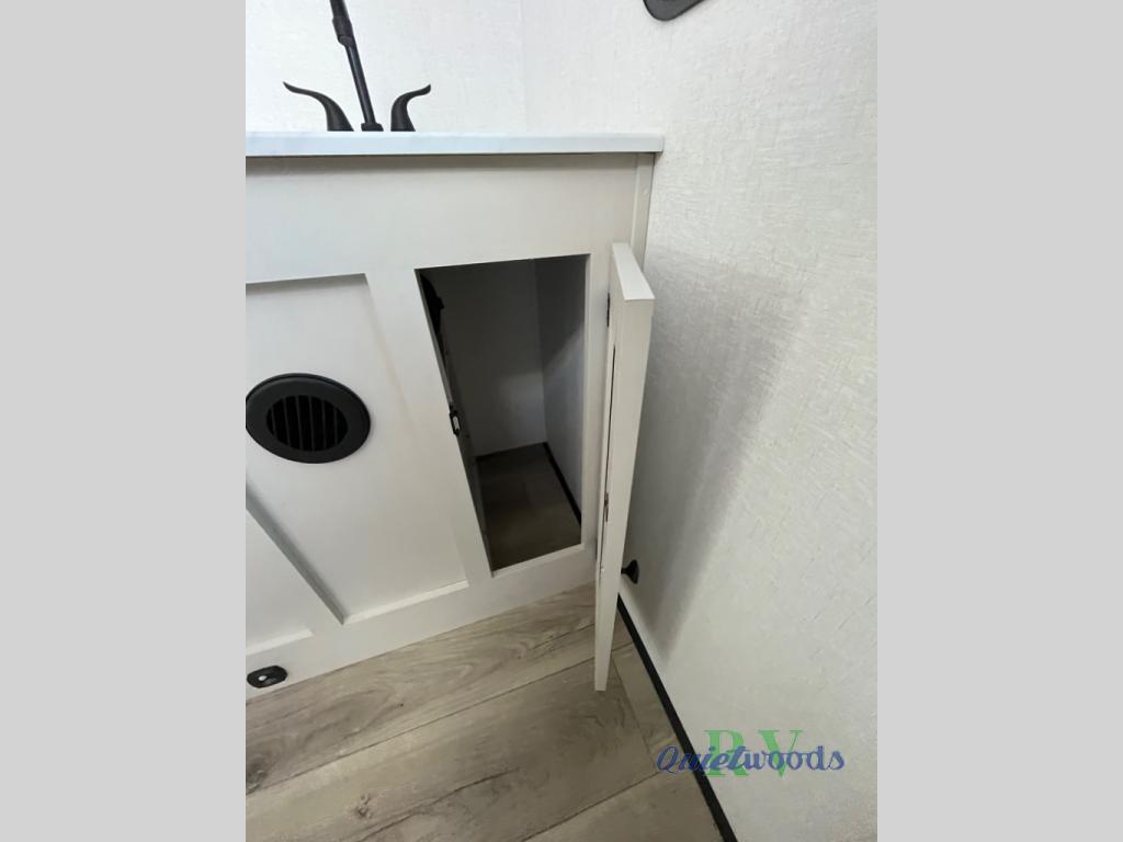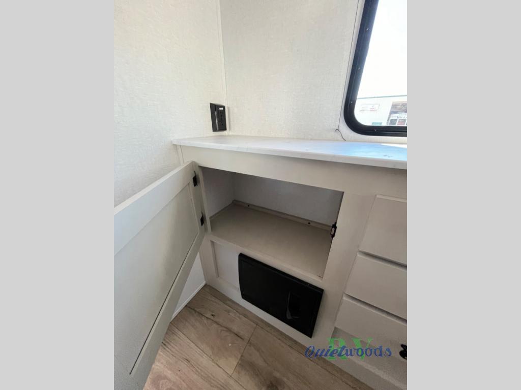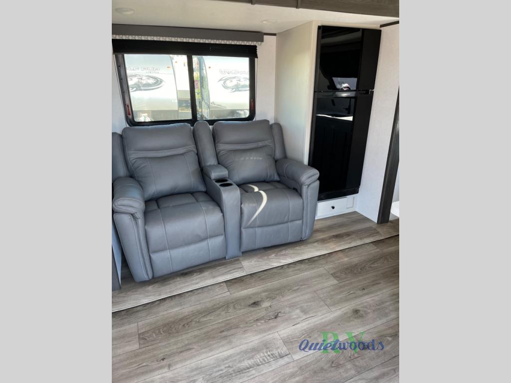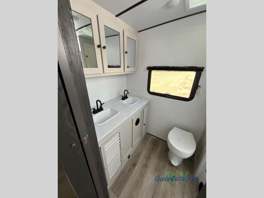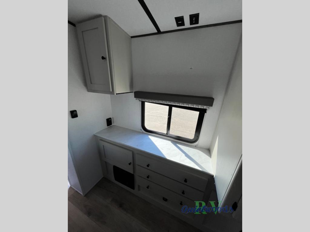 A rear bath with dual sink vanity, a king bed slide with drawers beneath for plenty of storage, and a front kitchen with breakfast bar and pantry as you enter all make this a great unit. You will enjoy plenty of space with a large slide in the bedroom and combined living area and kitchen. Theater seats are perfect for winding down your day inside, and a slide out king bed is a great way to enjoy a great night's rest. There is even washer and dryer prep in the bedroom if you choose to add those appliances! In the very rear of the unit, a spacious bath with large shower, a linen cabinet and dual sink vanity so both can get ready at once. In the front kitchen you will find all the amenities to enjoy creating meals and snacks as you travel. There are two pantries with one just inside the door to your left, and one along the front wall near the refrigerator and theater seating slide.