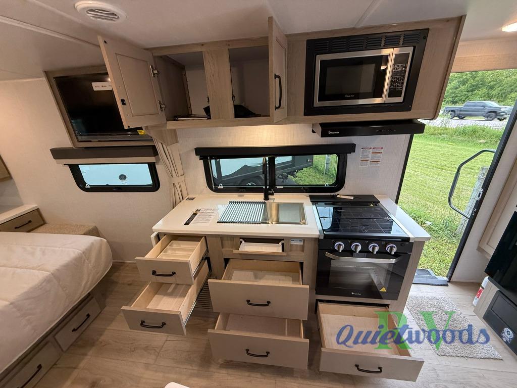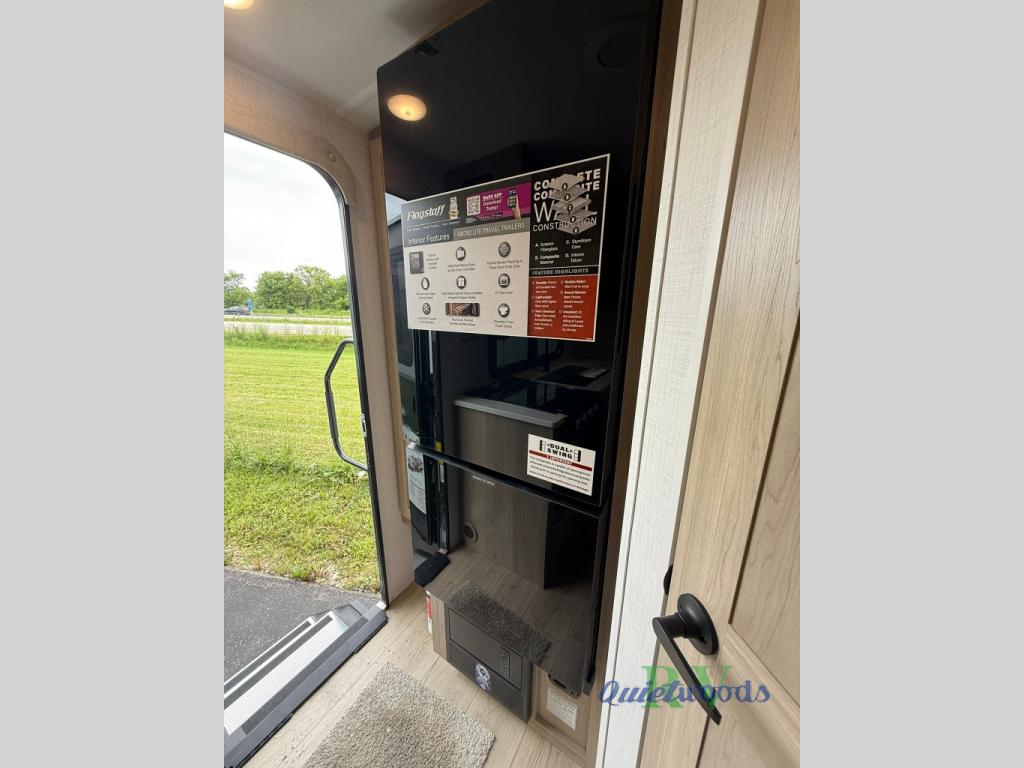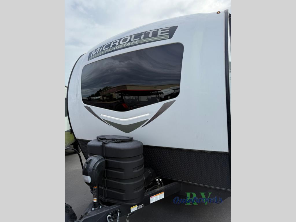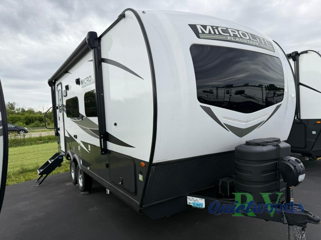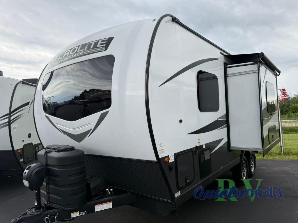 With any Flagstaff Micro Lite travel trailer by Forest River you will enjoy lightweight towing, durable construction, and added interior comforts to make each trip memorable! Each model features a torsion axle, Rubber-Ryde suspension, nitrogen filled, Goodyear Endurance tires, and easy lube axles with Nev-R-Adjust brakes for smooth towing from home to campground. The 6-sided aluminum framed construction provides a strong foundation so you can enjoy your RV for years to come, plus electronically controlled heated holding tanks and an enclosed underbelly will let you camp all year long. Head inside to find hybrid woven flooring in the slide outs, Sedona wood cabinetry, solid surface kitchen countertops, and many more amenities. These travel trailers also include exterior conveniences for hassle-free camping, like the power tongue jack, magnetic compartment door catches, Keyed Alike locks, and rear ladder to name a few!
