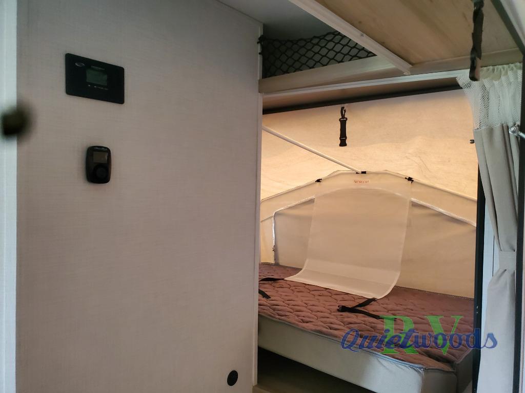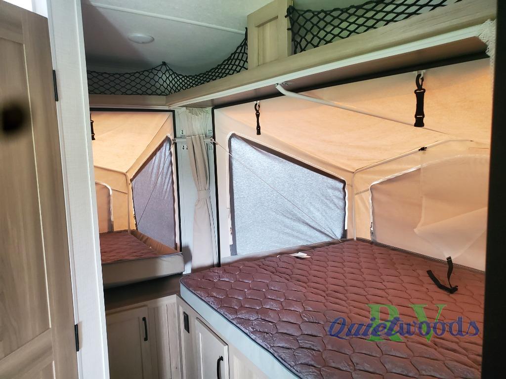 If you're looking for more sleeping space and added interior space, your search is over! This expandable includes three queen tent end beds, plus a U-shaped dinette and a flip sofa to sleep nine! A three burner cooktop and microwave oven in the kitchen will allow you to prepare meals each day, and there is an added exterior griddle for dinner outside. This model also includes an impressive amount of storage, including a kitchen pantry and exterior storage for hiking gear and tackle boxes!