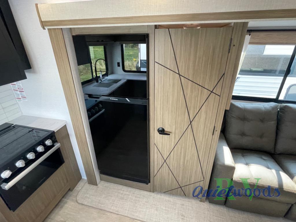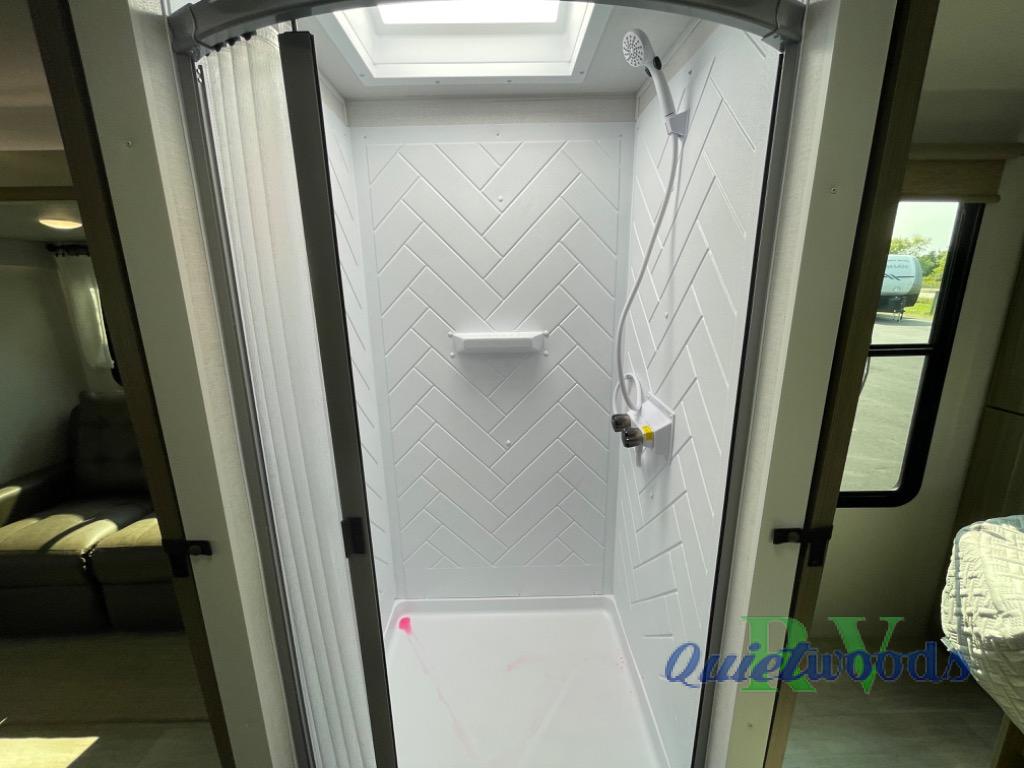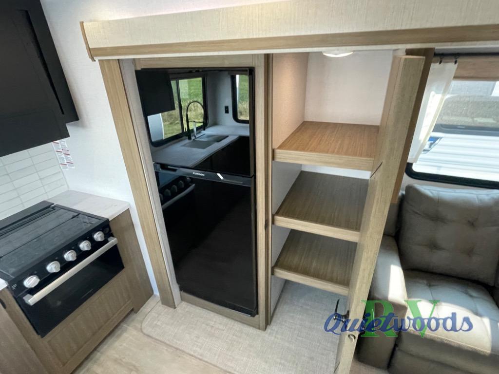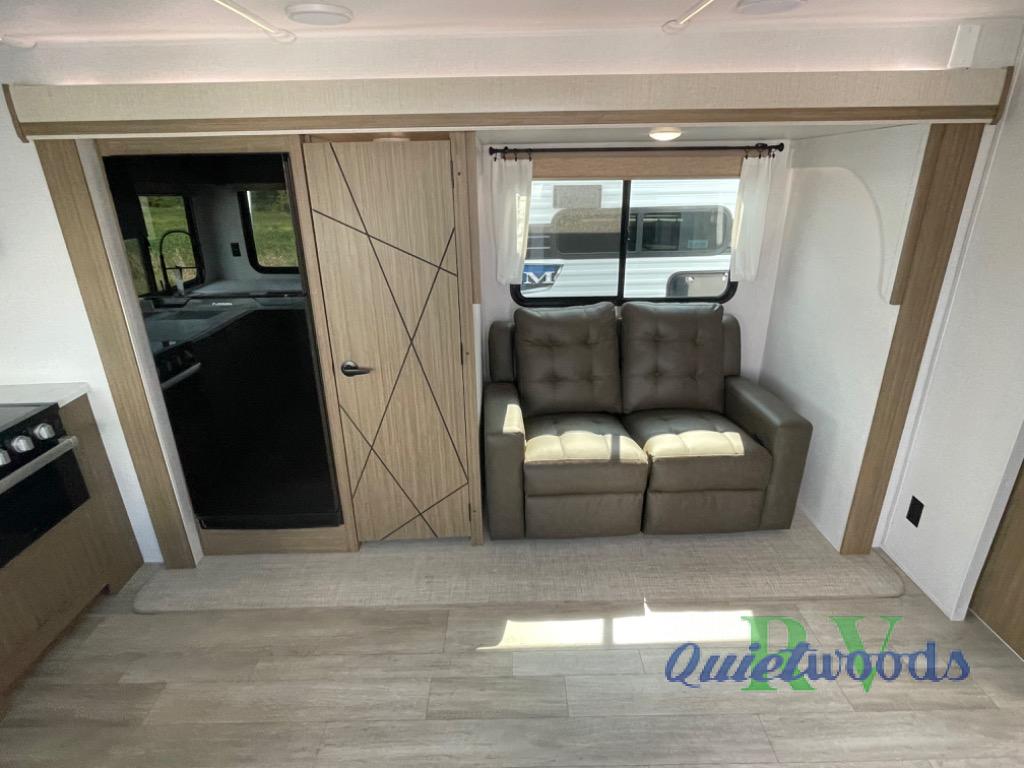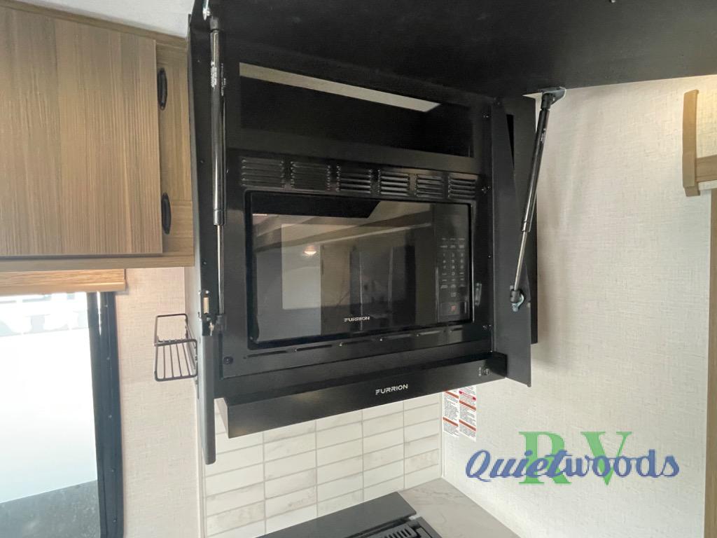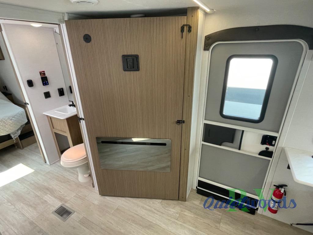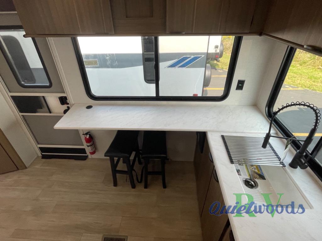 You're going to love cooking in the rear kitchen of this travel trailer! It has everything you need to prepare delicious home cooked meals including a large pantry and oversized fridge, plus there are two bar stools to sit on while you enjoy them. The theater seating is conveniently across from the swiveling entertainment center which has a fireplace and hidden shelves behind it for your games and movies. As you walk-through the bathroom, you will notice a walk-in shower to the left and a toilet and sink to the right. It leads directly into the front private bedroom which has a Versa-Tilt custom king bed to lay your head on at night and wardrobes/nightstands on either side for your items!