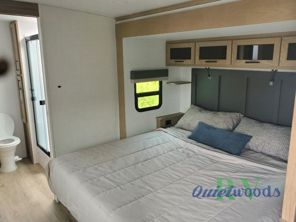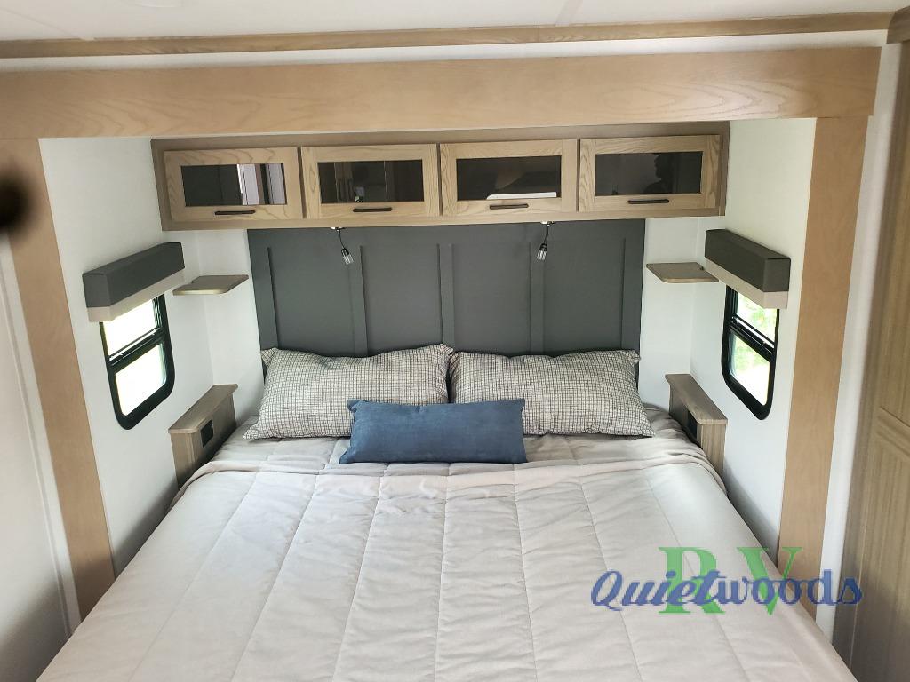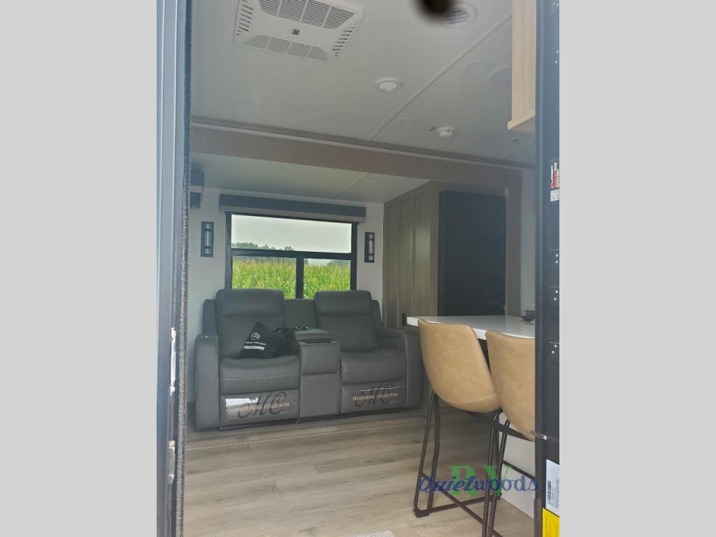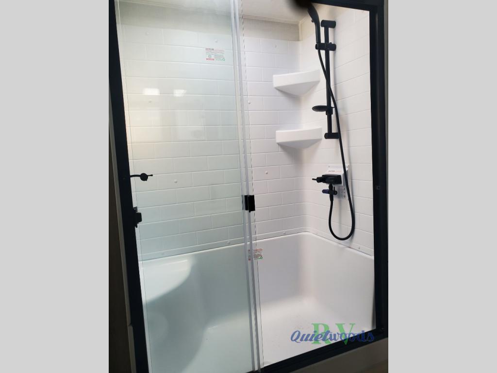 You will love how open this travel trailer will feel with the large front window that you can look out from the two-person bar top seating! The front kitchen has plenty of countertop space for you to prepare your best meals. Your nights will be spent in true relaxation with a 67" theater seating and king bed slide in the bedroom for a great night's rest. The full rear bathroom has a shower with a seat to take a nice, hot shower before bed, and a dual-sink vanity for two to get ready at once in the mornings!