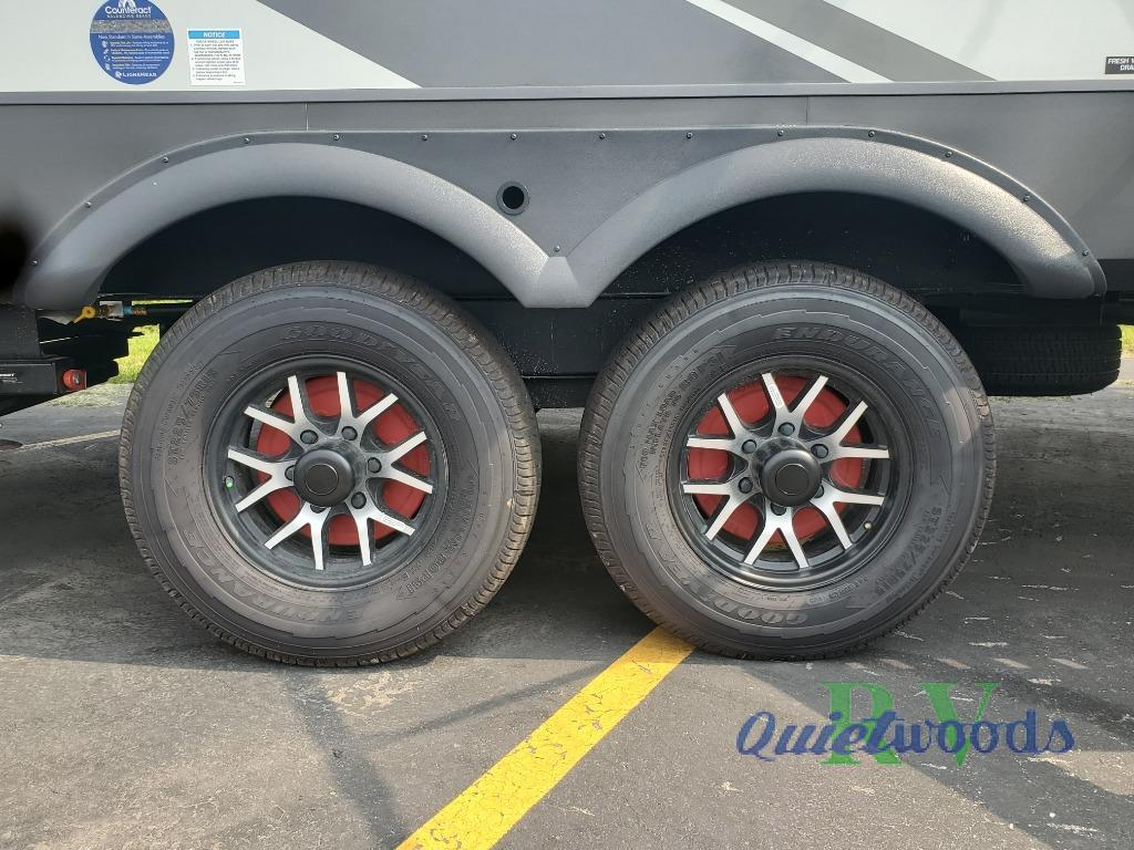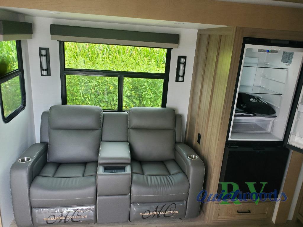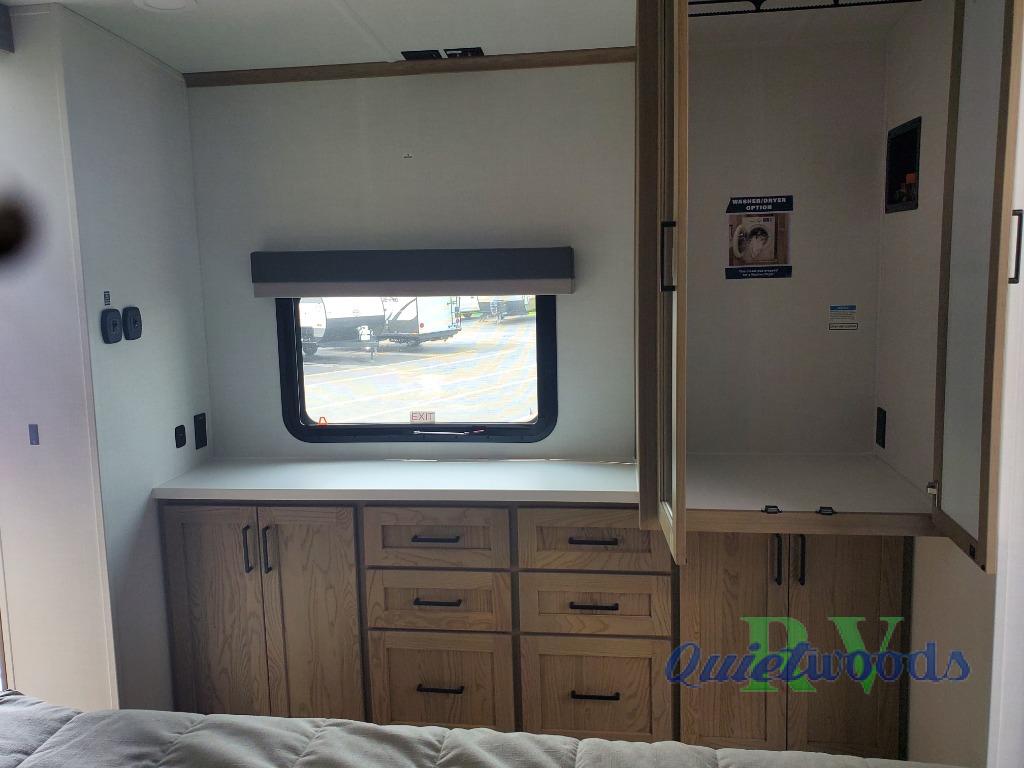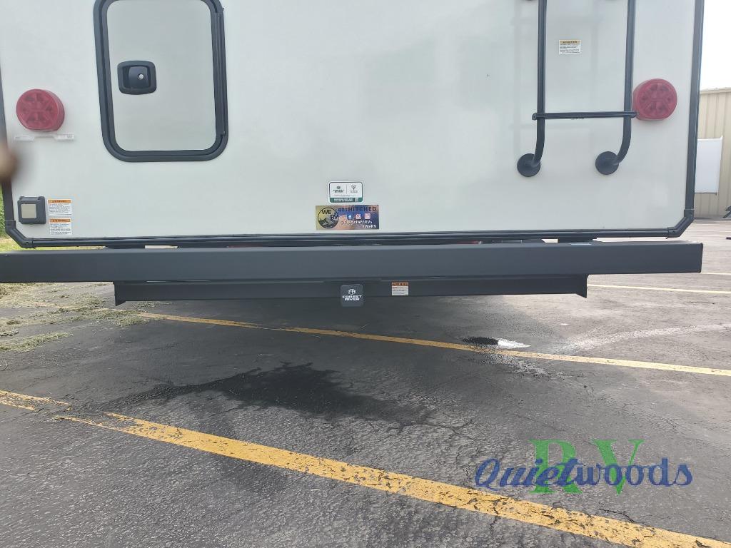 You will love how open this travel trailer will feel with the large front window that you can look out from the two-person bar top seating! The front kitchen has plenty of countertop space for you to prepare your best meals. Your nights will be spent in true relaxation with a 67" theater seating and king bed slide in the bedroom for a great night's rest. The full rear bathroom has a shower with a seat to take a nice, hot shower before bed, and a dual-sink vanity for two to get ready at once in the mornings!