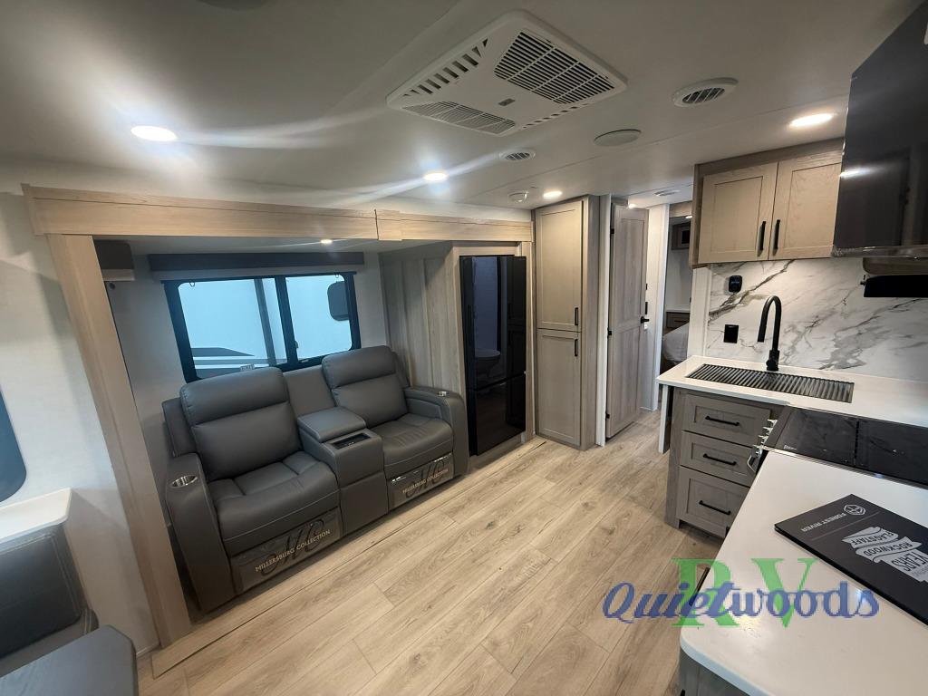It will be so easy to enjoy time at the campground in this cozy travel trailer. The full kitchen includes a three burner gas oven, a microwave oven, and a 12V refrigerator to cook and store food, and the pantry will let you stock up on snacks. Your crew can get comfortable on the theater seat or around the rear U-shaped dinette, and there is a smart TV here to make it a movie night. The walk-thru bath will let you freshen up each day, and the queen bed in the front bedroom is sure to bring comfort. You will also find one of the dual entry doors here for convenience plus a wardrobe slide out for more storage and floor space. The exterior is just as accommodating with its pass-thru storage, 2" receiver hitch, and 21' power awning!