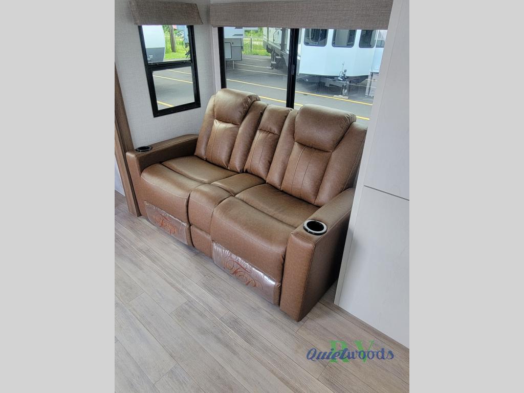 You'll love camping trips in this couple's trailer! The rear of this unit includes a full-width bar top with two stools, and in the corner there is a 40" TV with shelves for movies or books. You can relax comfortably on the theater seating that is close by the pantry and 12V residential refrigerator to grab a snack. A walk-through bath is spacious so you can easily clean up each day, and the front master bedroom is sure to bring comfort. Here, you'll find a custom king bed with underbed storage, dual bedside closets, plus one of the two entry doors for added convenience!