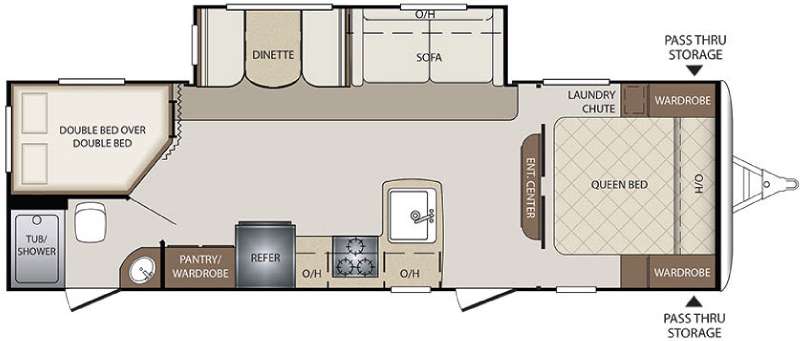 In the rear of 272BHS there is a double bed set of bunks with angled corner and ladder for accessing the top bunk, plus a privacy curtain. The opposite rear corner features a full bath with private entry from outside, and includes a tub/shower, toilet and sink.