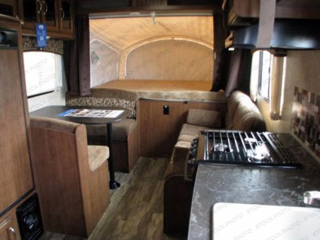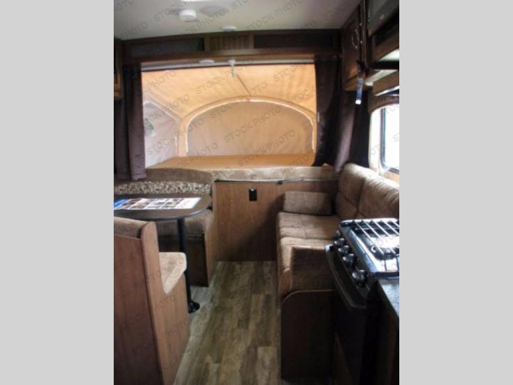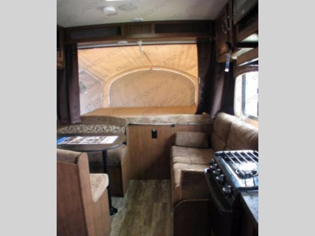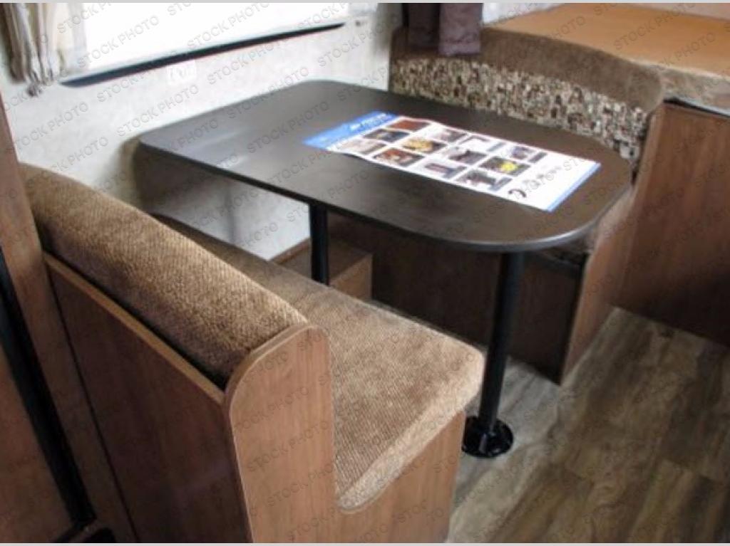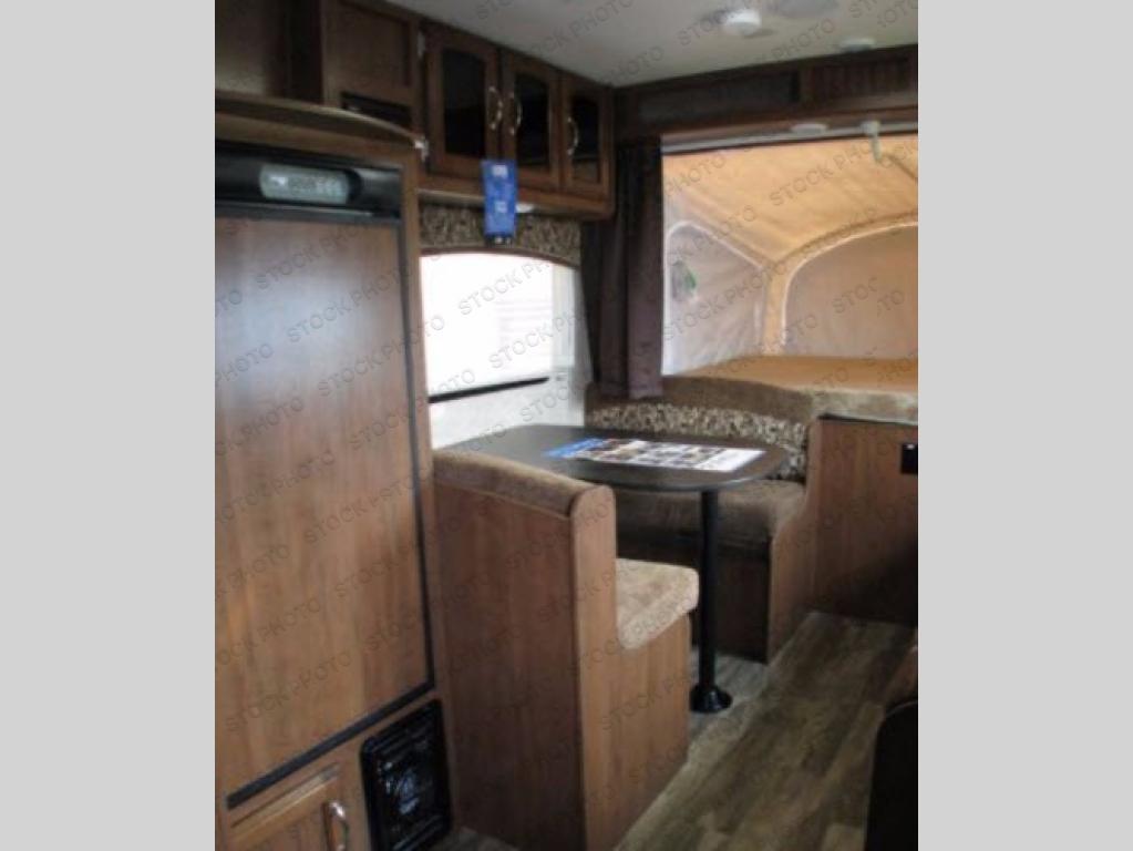 Along the opposite side of the expandable you will find a dinette with overhead storage, refrigerator, and a TV shelf.