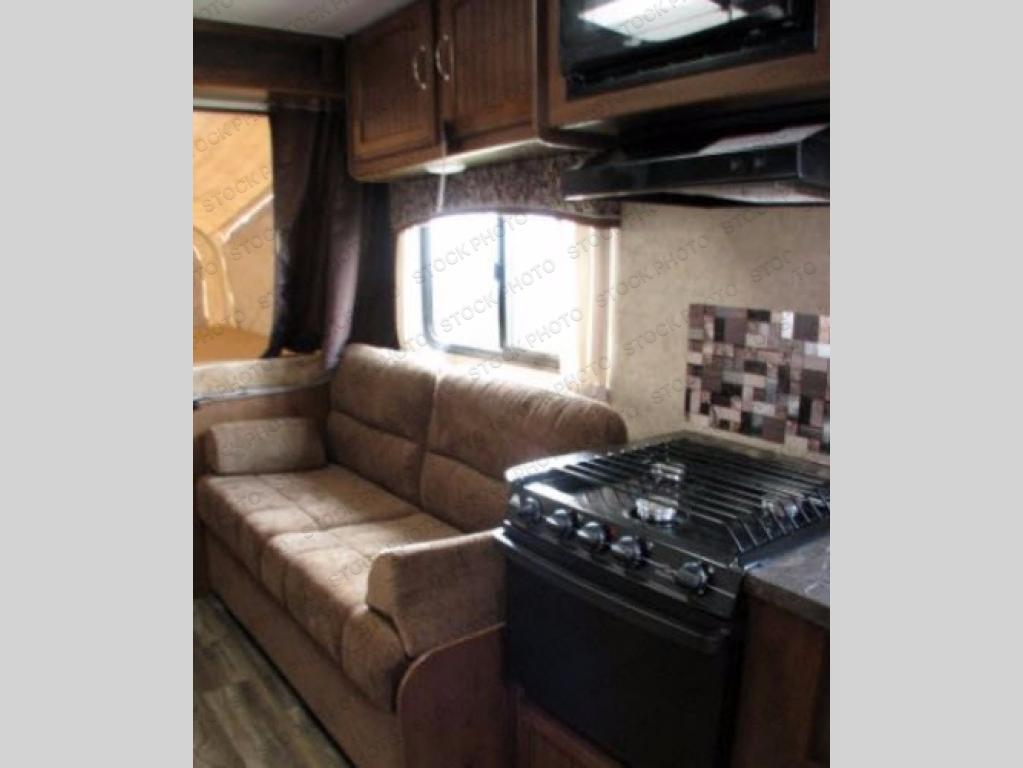 As you enter the expandable, to the right there is a kitchen sink, three burner range, microwave, sofa, and overhead cabinets.