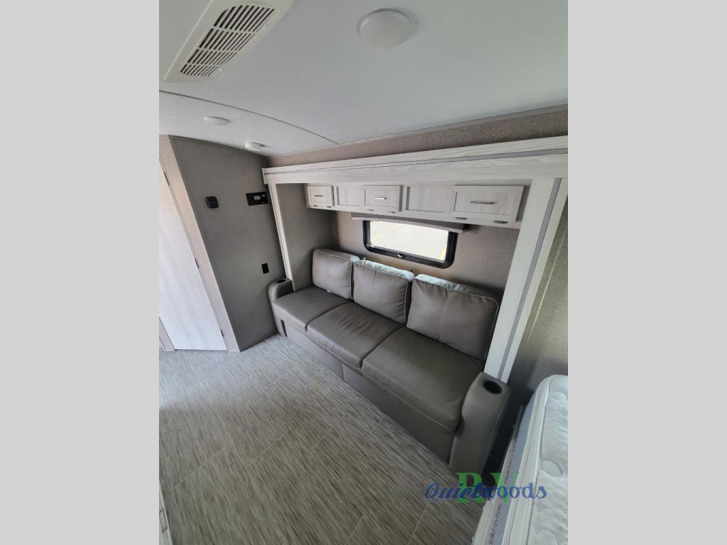 Come see just how fun and easy camping can be with this single slide sofa with cupholders and a table giving you more floor space between the front and the rear of the trailer to move about without having to squeeze in. The rear corner full bathroom is across from the entry allowing you quick access inside and back outside so that you don't have to miss anything. You can make meals in the kitchen area or outside on the gas griddle, watch the 12V TV, and sleep on the queen-size bed up front with overhead storage. You even have a handy exterior ladder on the rear if you need to check the top of the trailer sometime.
