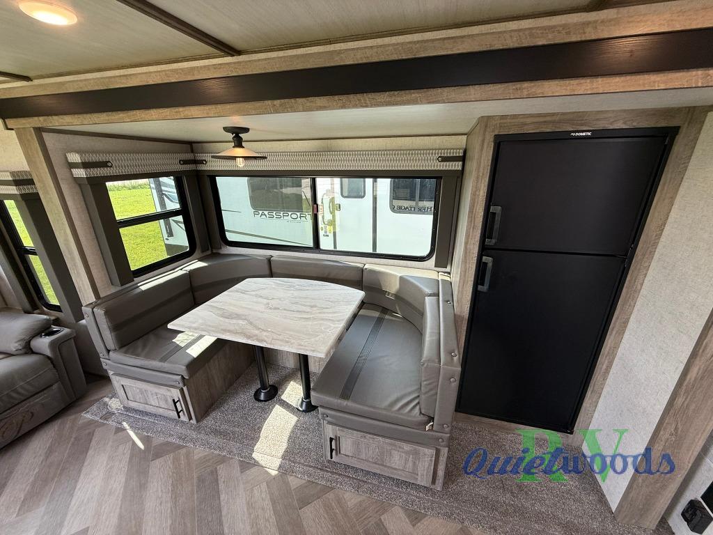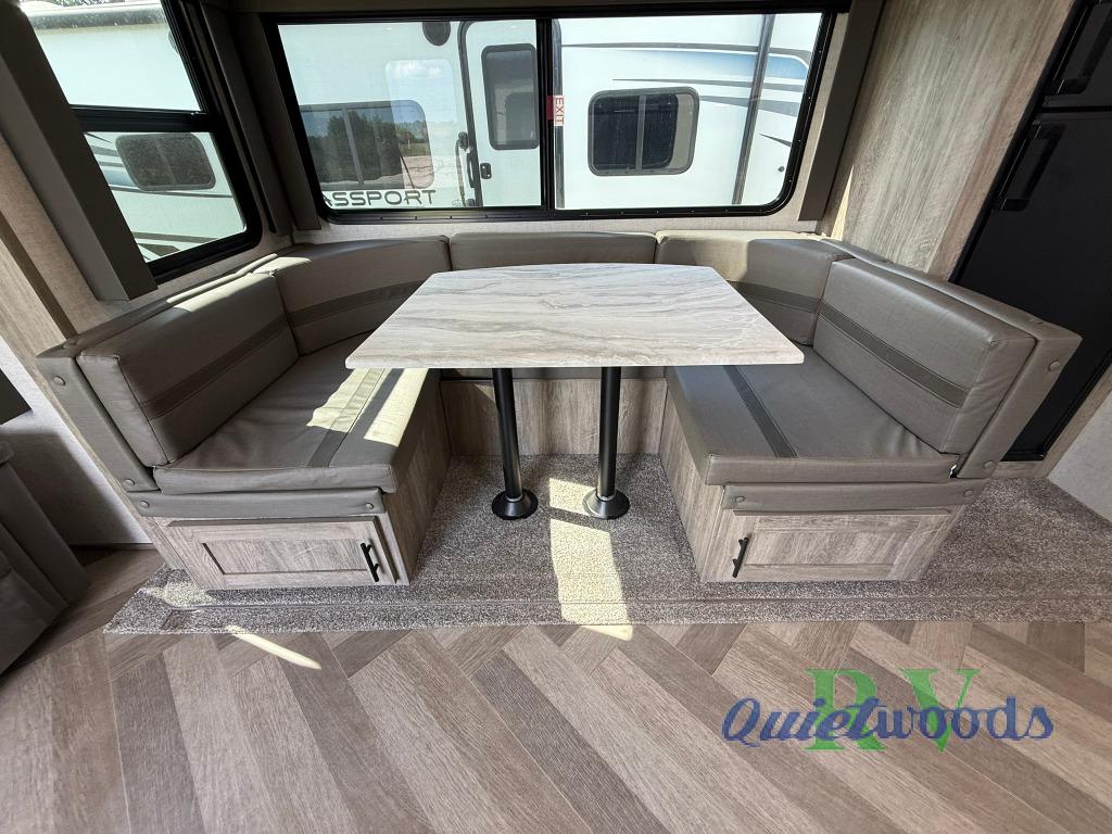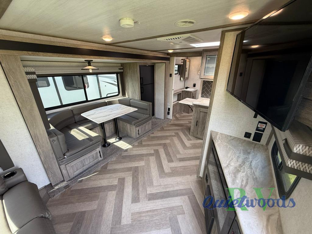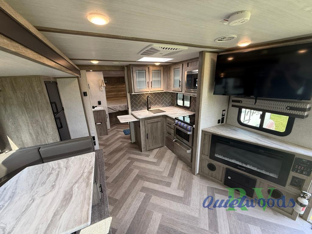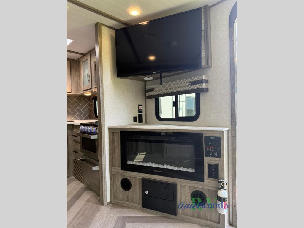 You're going to love camping with your own private bedroom which includes a walk-around queen bed with dual mirrored wardrobes and an entrance into the walk-through bathroom. You will find everything you need in the bathroom to get squeaky clean each morning including extra counter space. After you have whipped up a delicious meal with all the amenities needed plus a large pantry and residential refrigerator, you can head to the U-shaped dinette to dine inside while looking out the panoramic widows. You might like to watch a show on the 32" LED TV with the fireplace on and even recline in the sofa before heading outside for a hike or walk around the campgrounds.