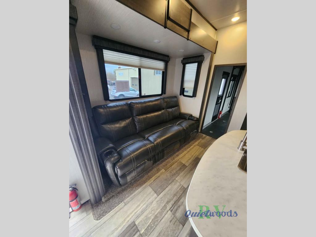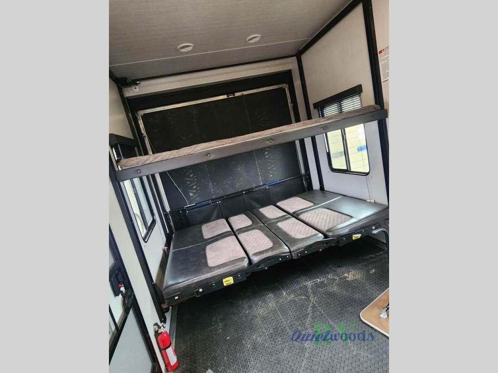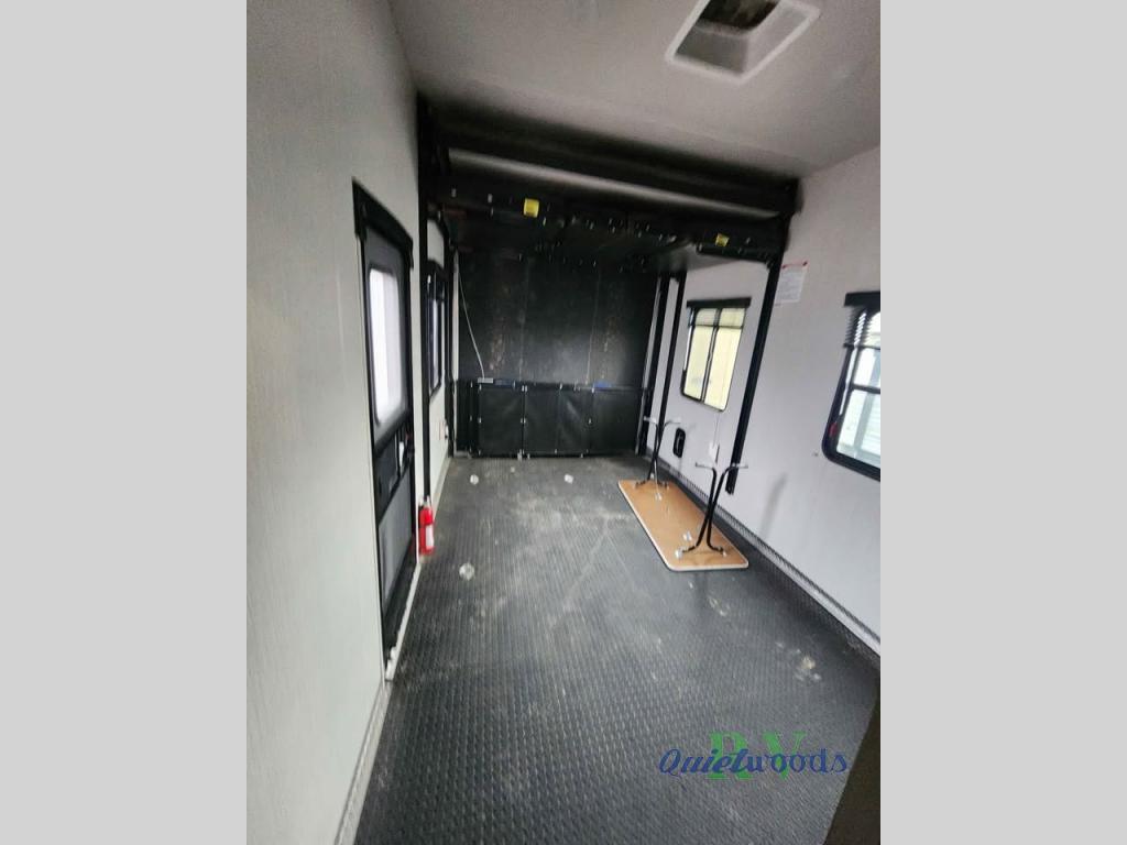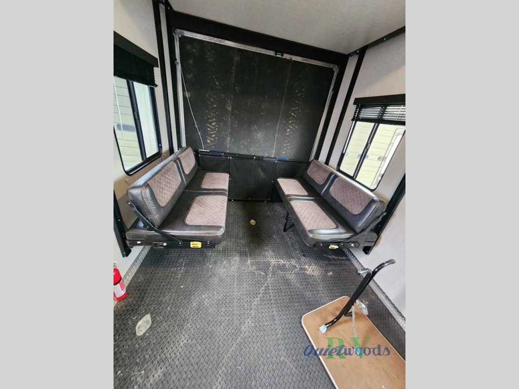 If you like to keep the dirt out of the main living area, this toy hauler gives you a separate garage with a side man door, a half bath for those quick breaks, and a power queen bed above opposing sofas with a dinette so the dirty shoes and all can stay in this area. After hitting the trails, you can get cleaned up in the full bathroom with a seated shower, make a meal in the kitchen and serve everyone from the counter peninsula then relax on the reclining sofa. The dual slides in this space offer everyone enough room to stretch out and recoup from the ride. And don't forget about your oasis in the front private bedroom with plenty of storage for your clothing and such.
