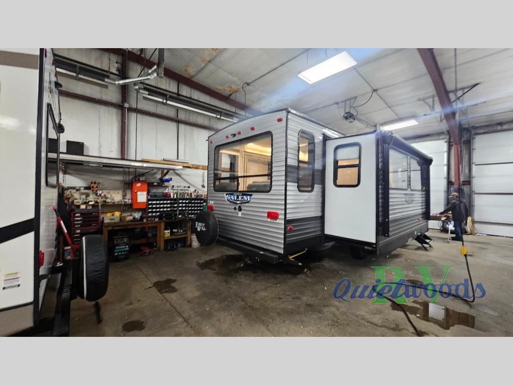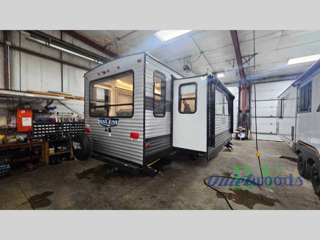 This Salem travel trailer is full of wonderful amenities that will make every trip enjoyable! The large opposing slides are what create an open and spacious environment so that you can sit back on the Versa Lounge, one of the two lounge chairs, or booth dinette while you soak in the ambiance from the fireplace. You can also head outside where you will find two awnings for your protection and a pass-through storage compartment for your gear. Also, the walk-in closet in the front private bedroom will certainly be helpful for storing those extra sweaters and hiking boots.