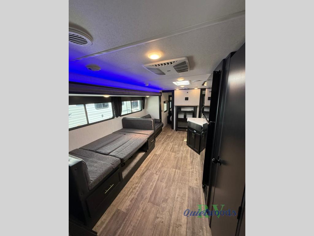 Come on inside this Cherokee Grey Wolf travel trailer and experience the convenience of a smooth flow of traffic in and out with two entry doors. The rear door leads into a full bath which is great for accessibility when outside and when you need to use the bathroom. Once inside, you will notice the large U-shaped dinette and the sofa which sit on the slide and create a spacious footprint for moving about, as well as great places to play games and socialize with your friends and family. A walk-in pantry provides plenty of storage allowing you to stock up on your favorite snacks and dry goods for your family adventure. At night, there is sleeping space for everyone between the double-size bunks and the queen-size bed, plus the furniture.