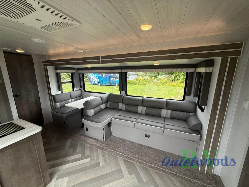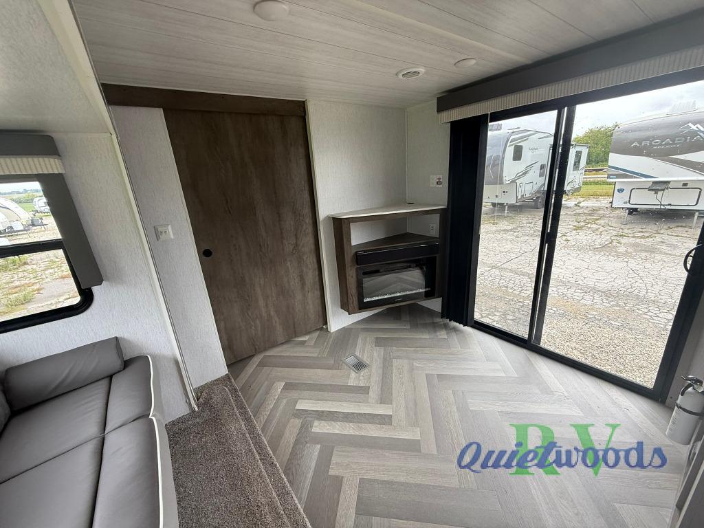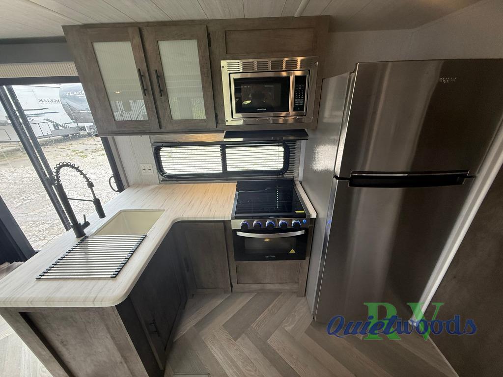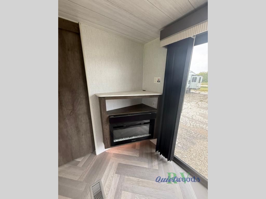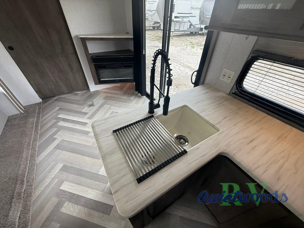After you've had a long day of sightseeing and adventuring, you will certainly appreciate having this Salem travel trailer to come back to! If you aren't ready to stay indoors for the night, you can keep the party going outside under the 18' awning, and if you need any extra lawn chairs, you can grab them from the pass-through storage compartment. And, you don't have to stop enjoying a good fire just because you have to go inside because the interior fireplace will provide great ambiance. There are dual entry doors which will definitely come in handy when camping with a large group, and there is plenty of seating space on the booth dinette and versa lounge in the main living area.