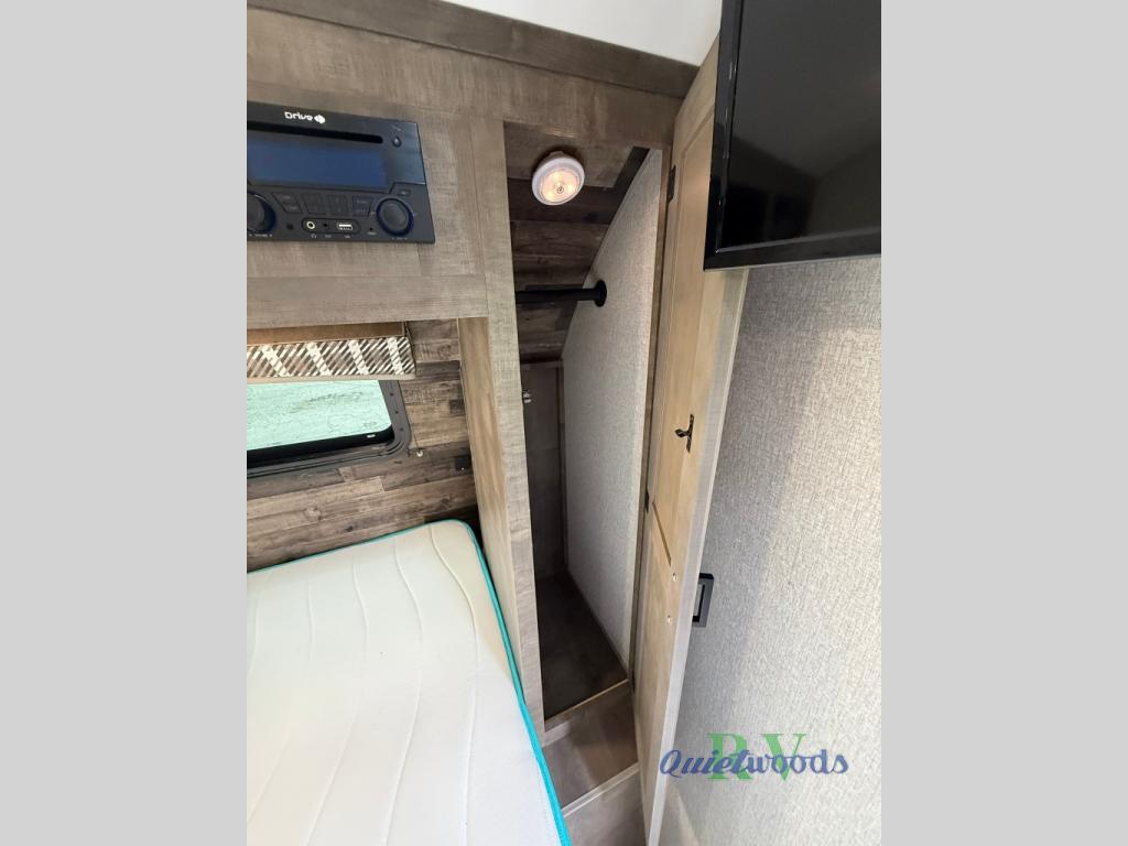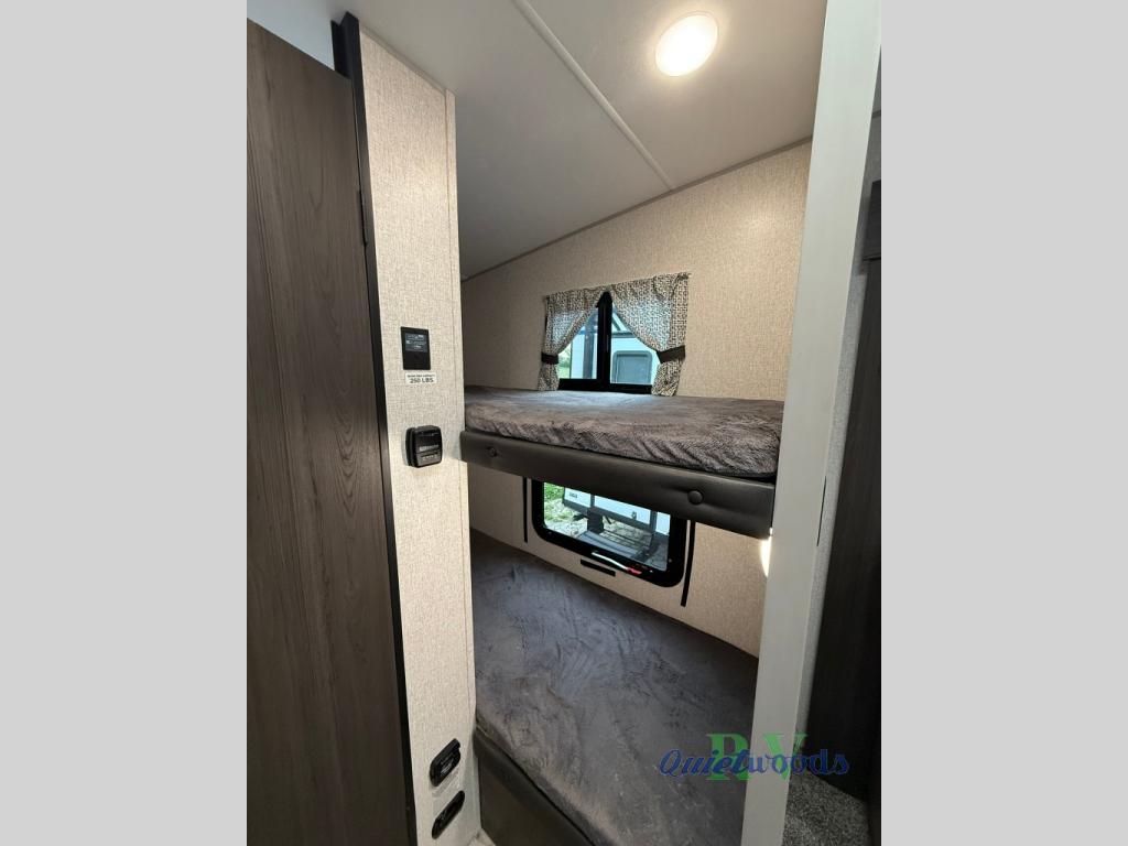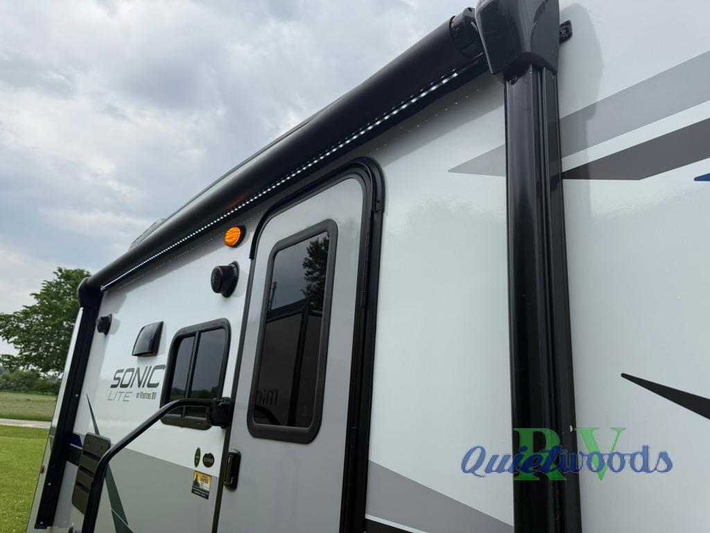 Looking for a family-friendly trailer that is easy to tow, sleeps six and includes a slide for more interior floor space? Step inside using the flip-up solid steps for safety into this Sonic Lite to find a 60" x 75" bed up front with a handy StorMore bedside nightstand with a 110V outlet and USB charging to keep your cellphones at 100%, plus an overhead cabinet for more things. You will love that the rear set of bunk beds is located next to the full bathroom which is helpful at night for the kiddos. You can make meals using the galley kitchen which includes an 8 cu. ft. refrigerator and a convection microwave or use the campfire cafe outside, and dine inside at the booth dinette or outside under the 13' power awning.