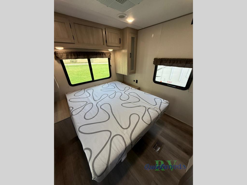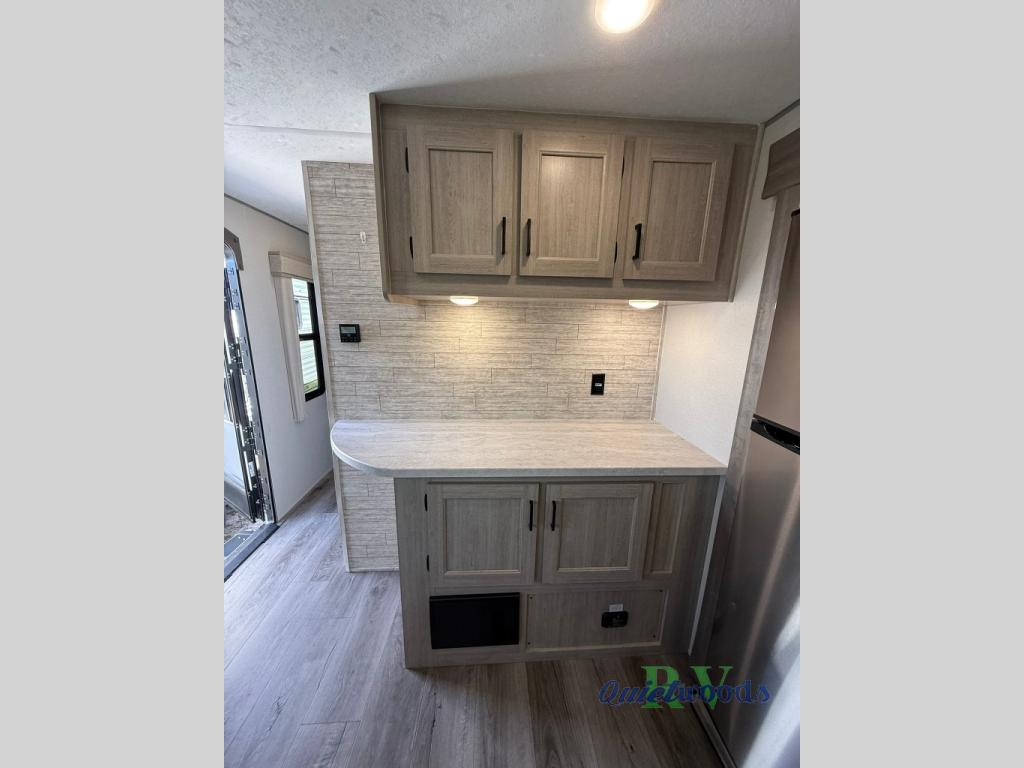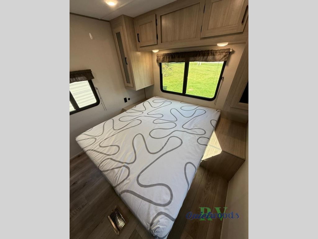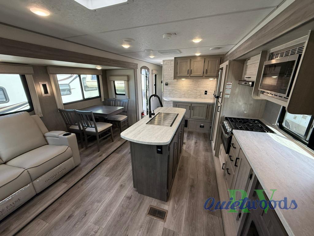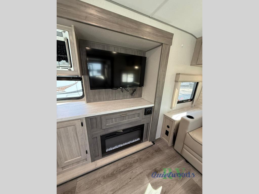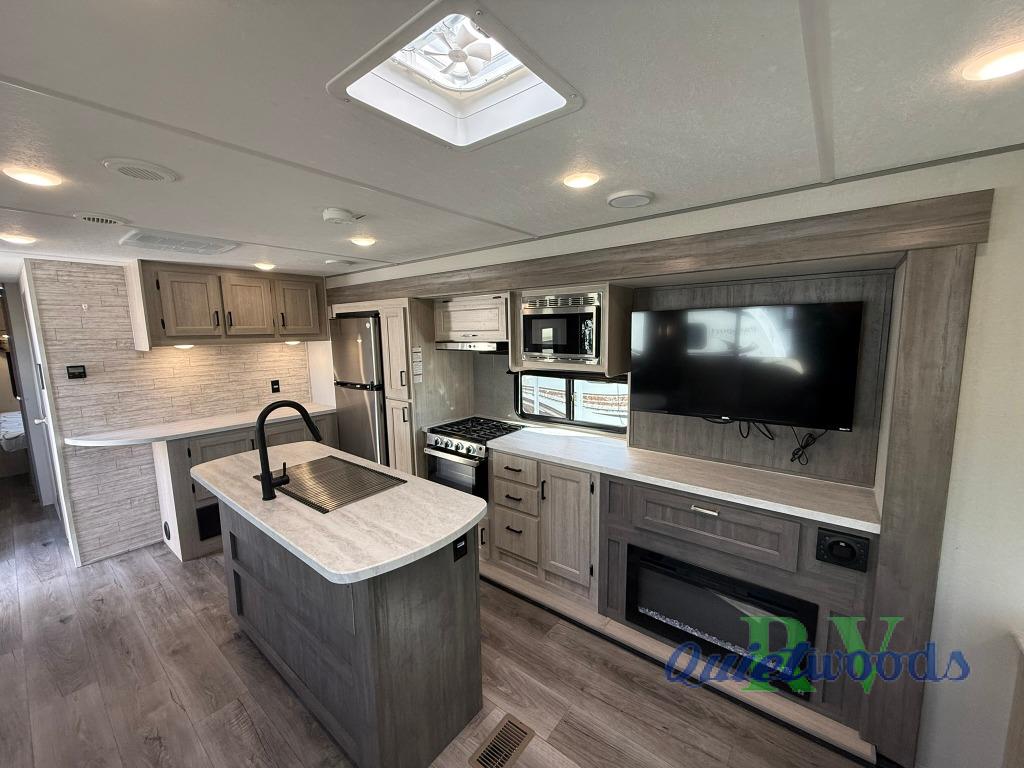 Summer camping trips just got sweeter in this spacious travel trailer that can sleep four to five each night. The dual opposing slides in the combined kitchen and living room will give your crew plenty of space to relax on the front sofa or the theater seating, and there is a booth dinette to dine at. There is even an optional fireplace if you want your space to feel a little more like home. A kitchen island with a double sink will make cooking and cleaning easier, and the bar area is sure to be a big hit when entertaining guests. The spacious full bath includes a 36" x 30" shower with a skylight and a convenient medicine cabinet to keep things tidy. When you're ready to turn in for the night, the rear bedroom with an RV queen bed is sure to bring a great night's rest. There are also dual wardrobes to keep your clothes organized and a closet with washer and dryer prep if you want the option to make laundry day easier.