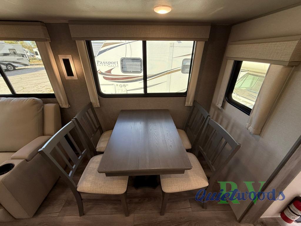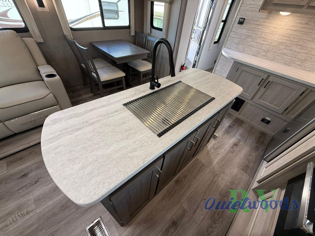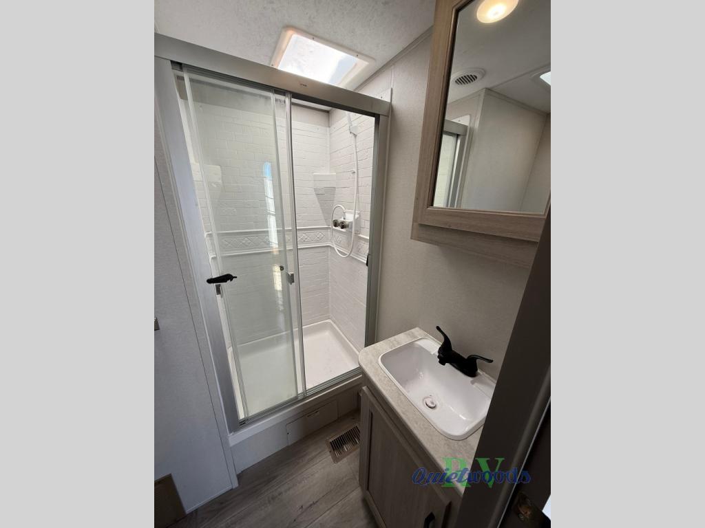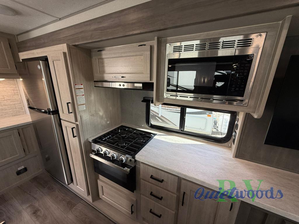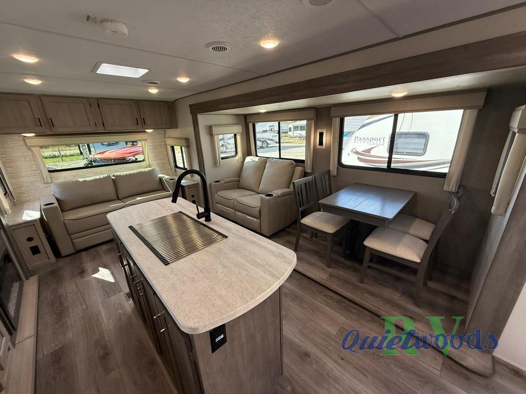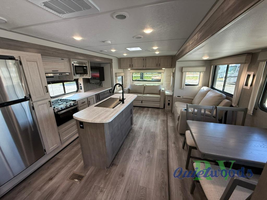 Summer camping trips just got sweeter in this spacious travel trailer that can sleep four to five each night. The dual opposing slides in the combined kitchen and living room will give your crew plenty of space to relax on the front sofa or the theater seating, and there is a booth dinette to dine at. There is even an optional fireplace if you want your space to feel a little more like home. A kitchen island with a double sink will make cooking and cleaning easier, and the bar area is sure to be a big hit when entertaining guests. The spacious full bath includes a 36" x 30" shower with a skylight and a convenient medicine cabinet to keep things tidy. When you're ready to turn in for the night, the rear bedroom with an RV queen bed is sure to bring a great night's rest. There are also dual wardrobes to keep your clothes organized and a closet with washer and dryer prep if you want the option to make laundry day easier.