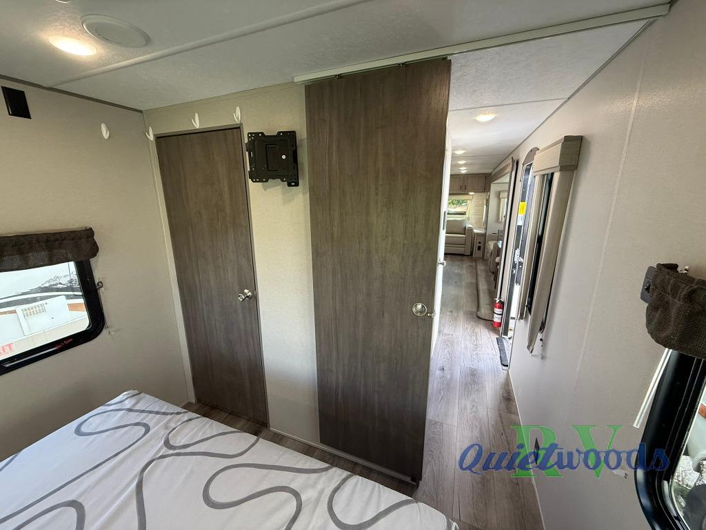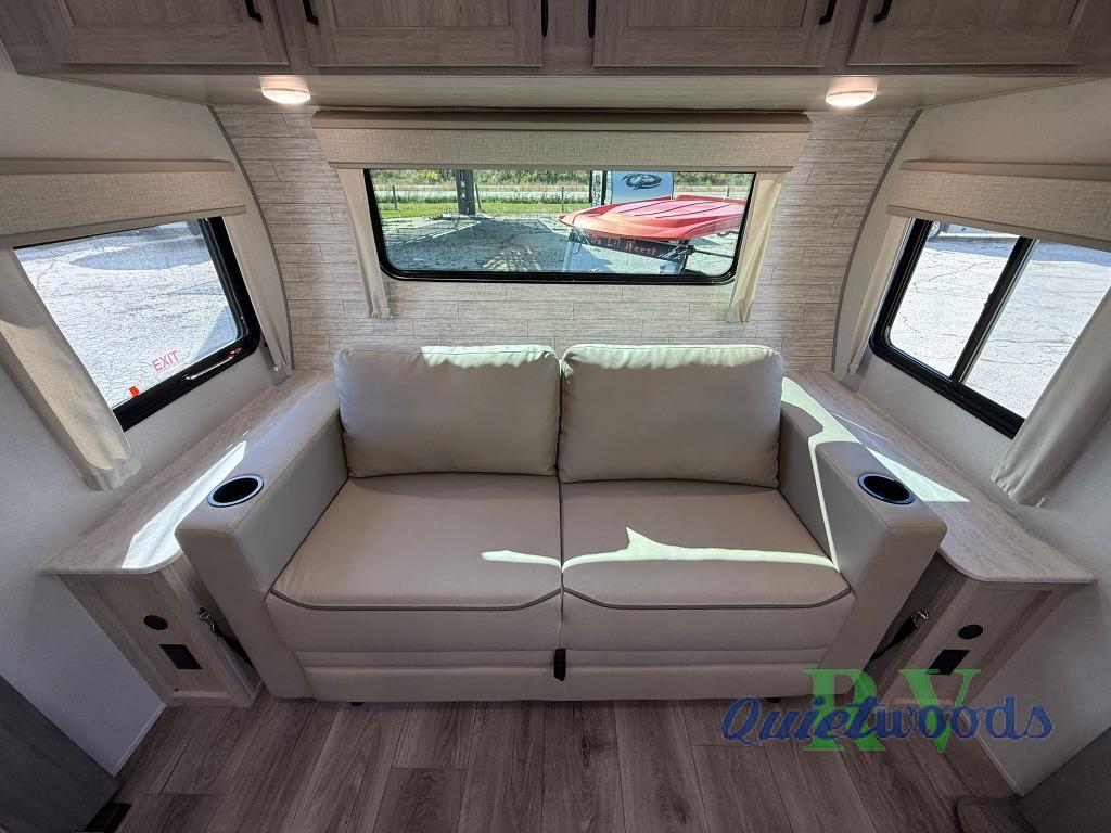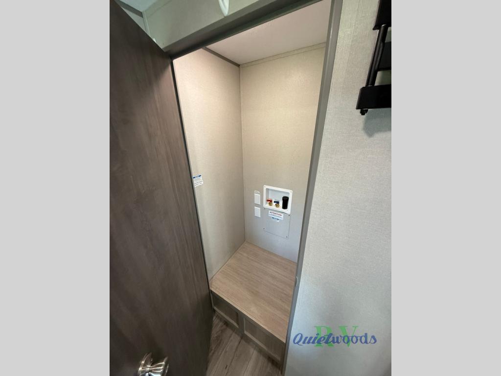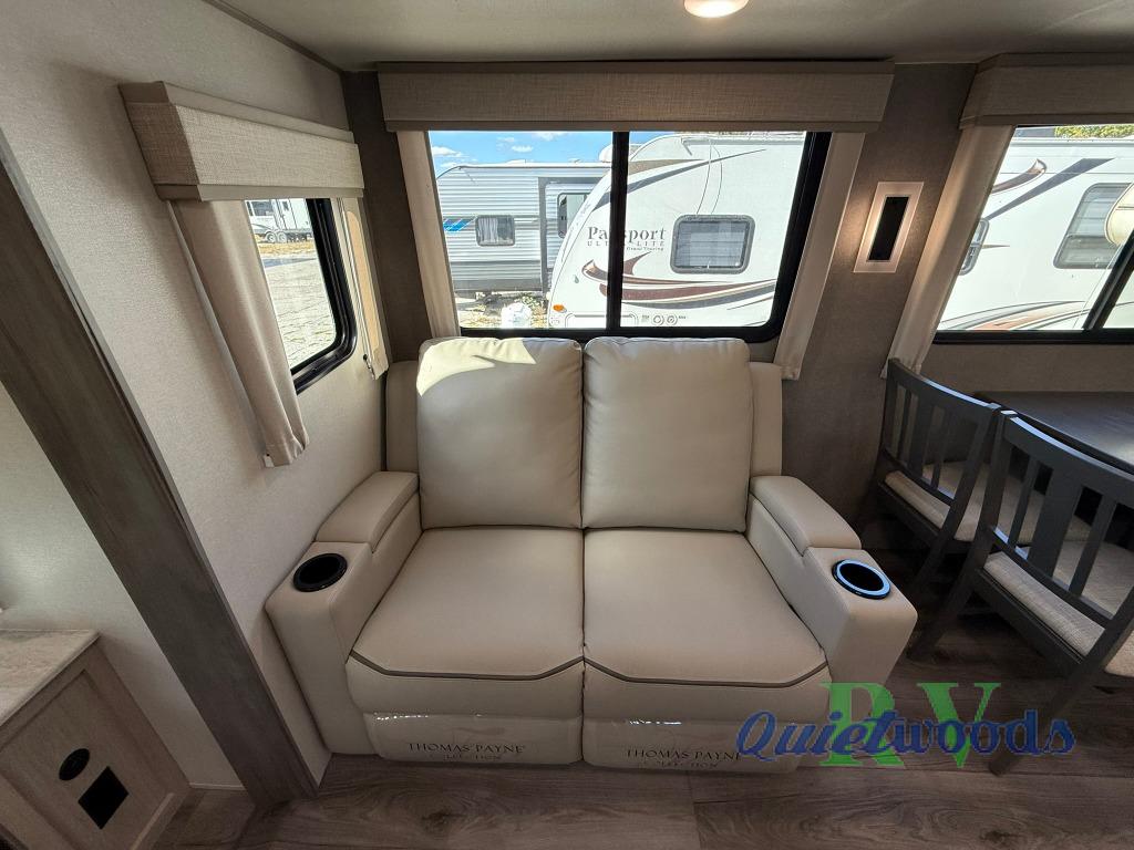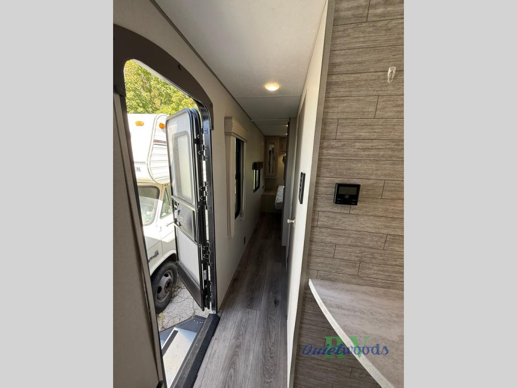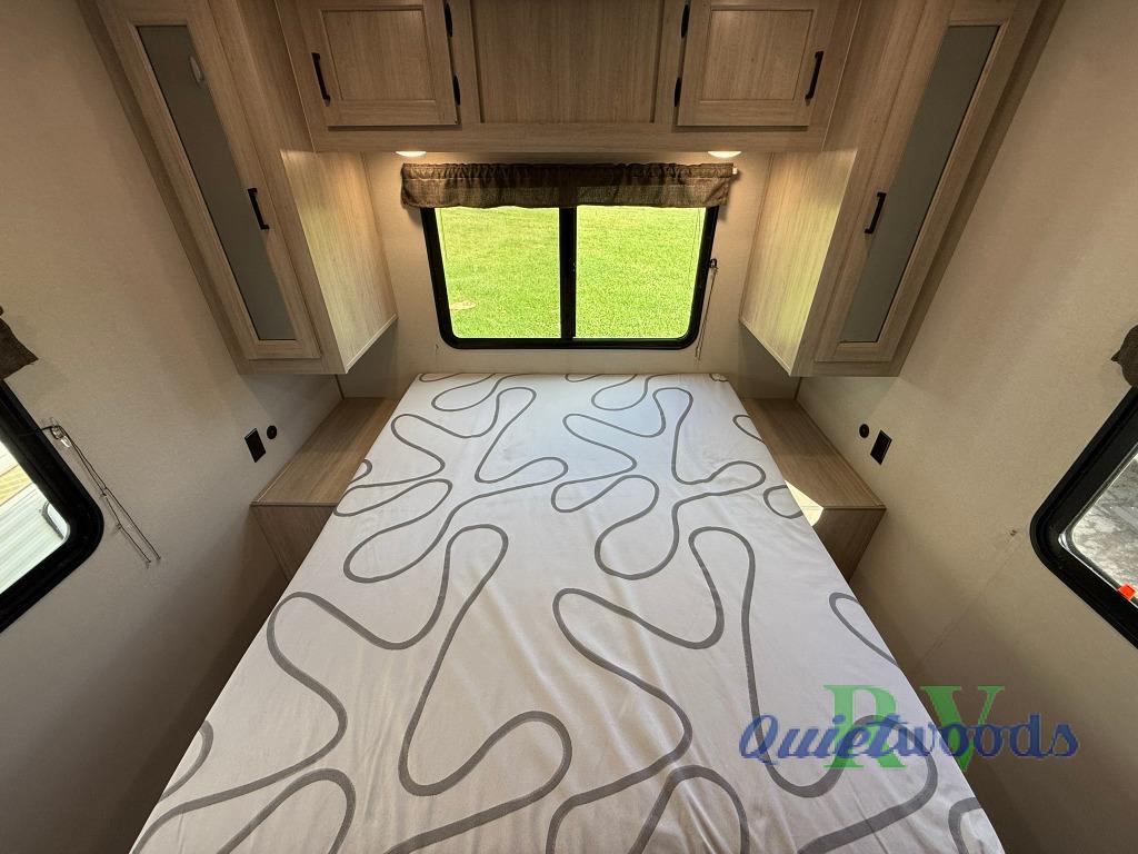 Summer camping trips just got sweeter in this spacious travel trailer that can sleep four to five each night. The dual opposing slides in the combined kitchen and living room will give your crew plenty of space to relax on the front sofa or the theater seating, and there is a booth dinette to dine at. There is even an optional fireplace if you want your space to feel a little more like home. A kitchen island with a double sink will make cooking and cleaning easier, and the bar area is sure to be a big hit when entertaining guests. The spacious full bath includes a 36" x 30" shower with a skylight and a convenient medicine cabinet to keep things tidy. When you're ready to turn in for the night, the rear bedroom with an RV queen bed is sure to bring a great night's rest. There are also dual wardrobes to keep your clothes organized and a closet with washer and dryer prep if you want the option to make laundry day easier.